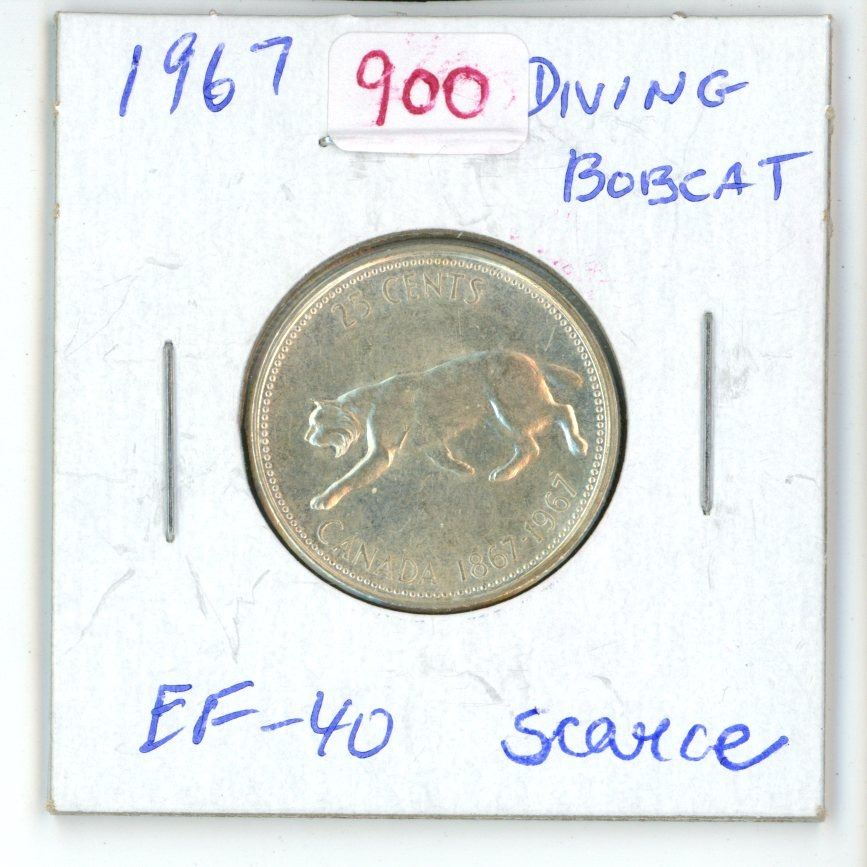 1967 Diving Bobcat Canadian Silver 25 Cents. Rotated Dies. EF-40. Scarce.