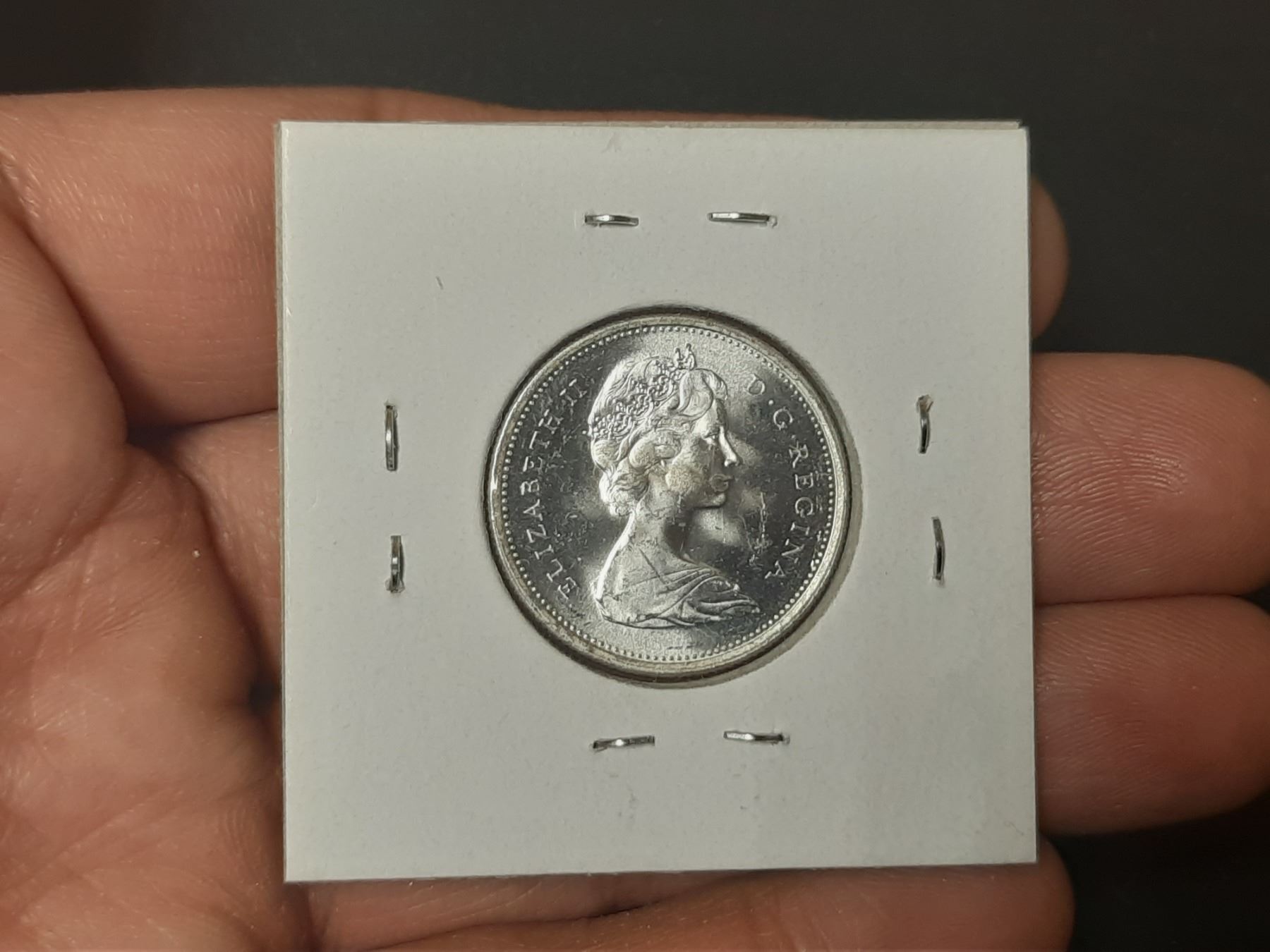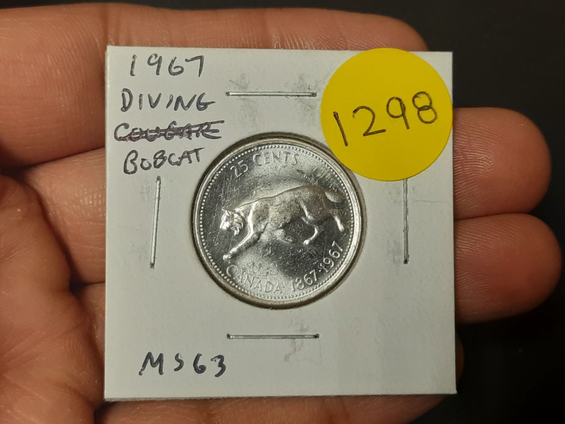 1967 Diving Bobcat Silver 25 Cents. Rotated Die so it appears the Bobcat is Diving. MS63.