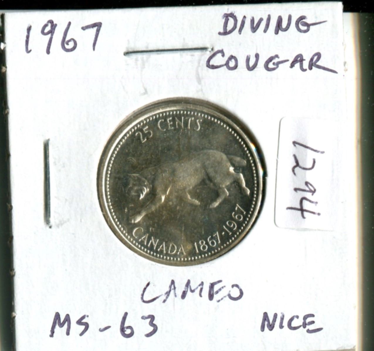 1967 Diving Cougar Silver 25 Cents. Rotated Die. MS-63 with Cameo. Nice.