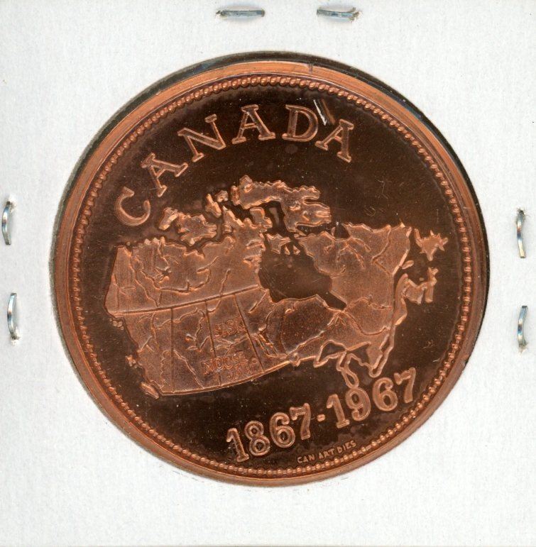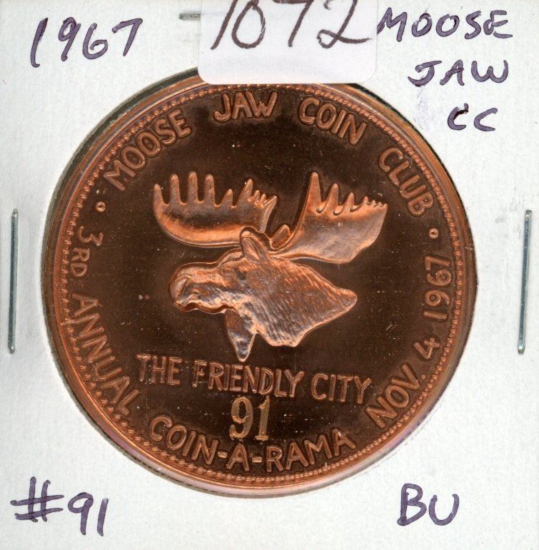 1967 Moose Jaw Coin Club 3rd Annual Coin – A – Rama medal. Hand engraved 91 to denote membership number 91. Also celebrates Canadian Centennial. BU.