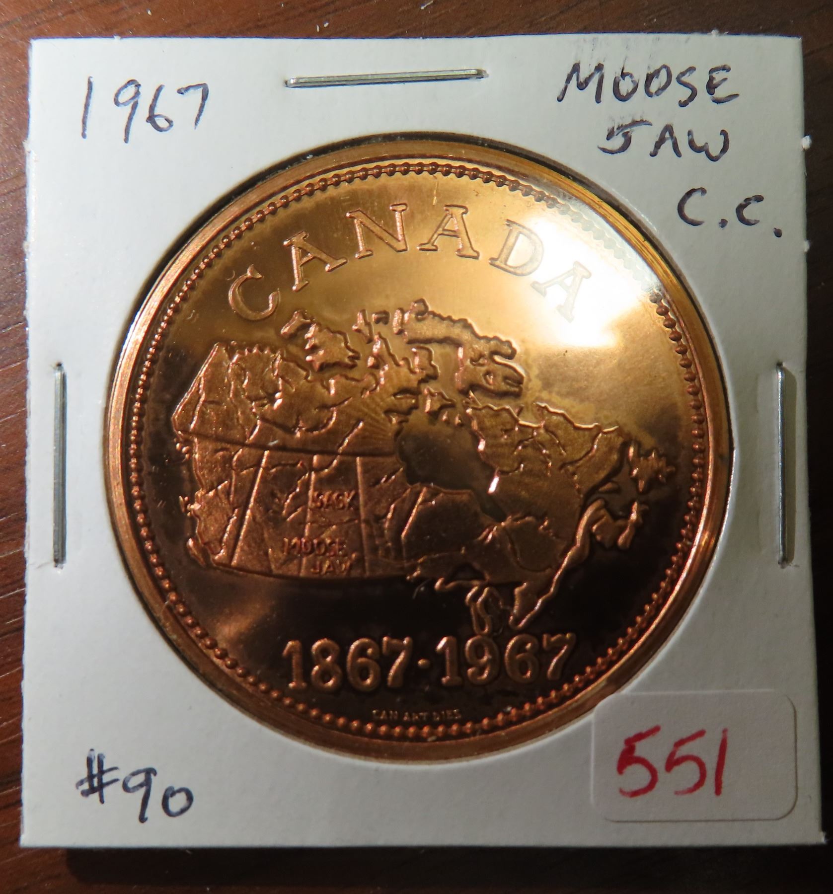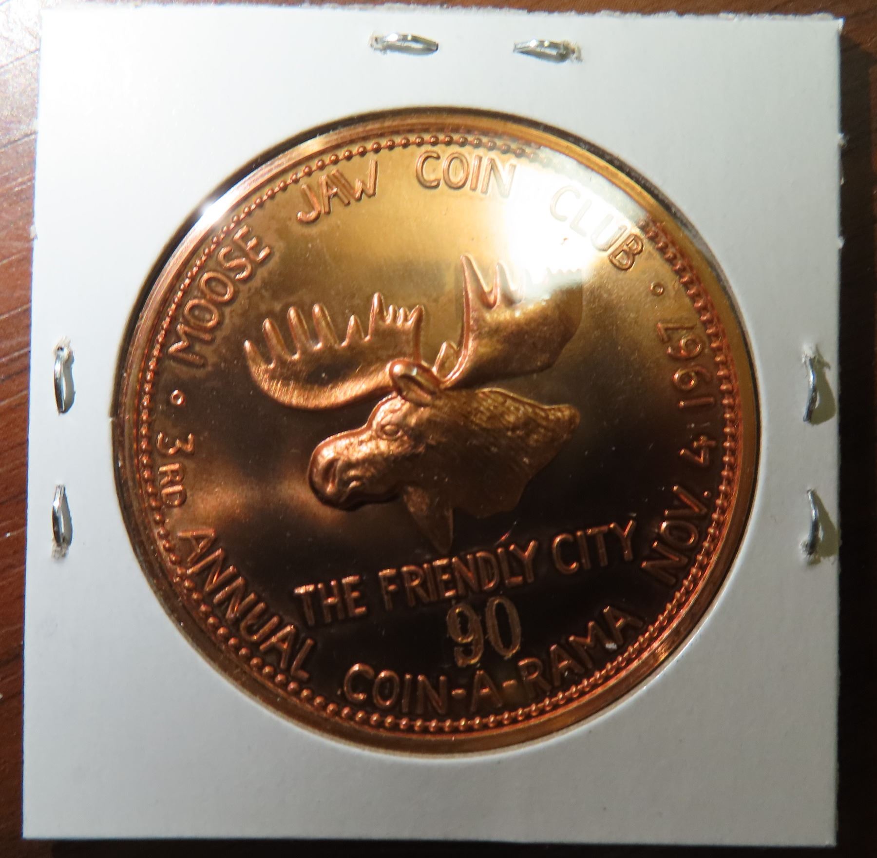 1967 Moose Jaw Coin Club Third Annual Coin-A-Rama bronze medal. Commemorates Canadian Centennial. Engraved 90 for MJ Coin Club member #90. BU.