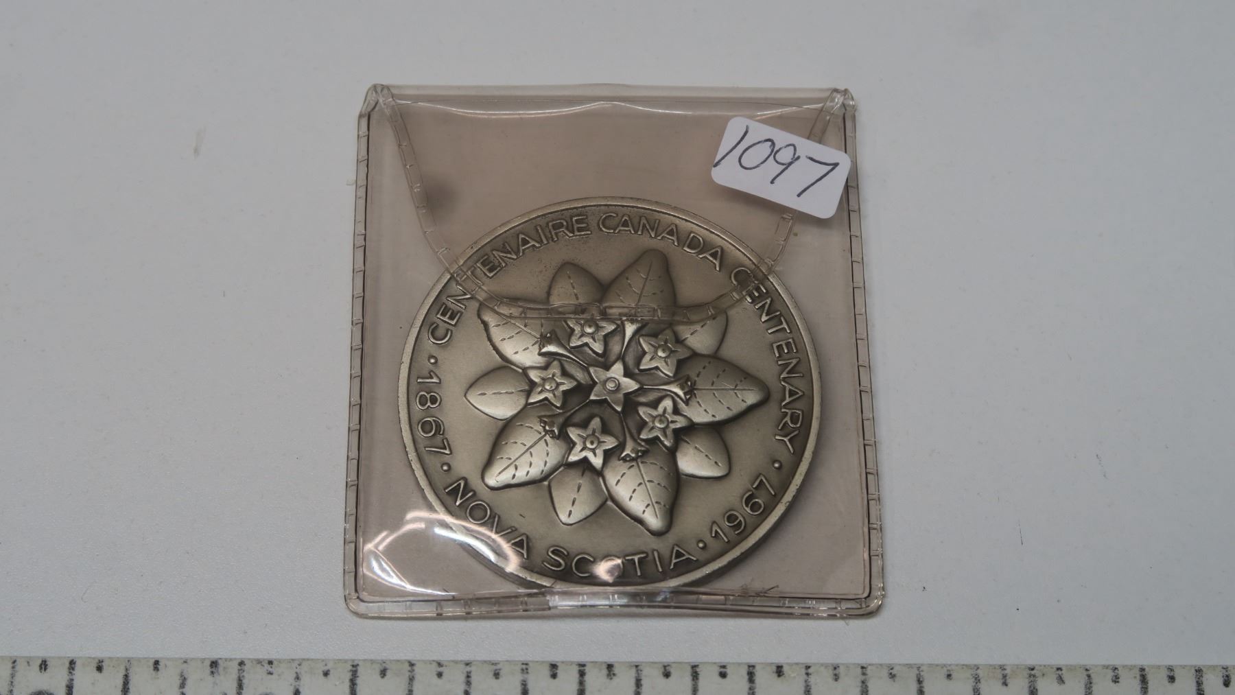 1967 Nova Scotia Centennial Medal. Huge 50mm Silver Plated medal depicting the provincial flower and map of Nova Scotia. BU. Scarce.