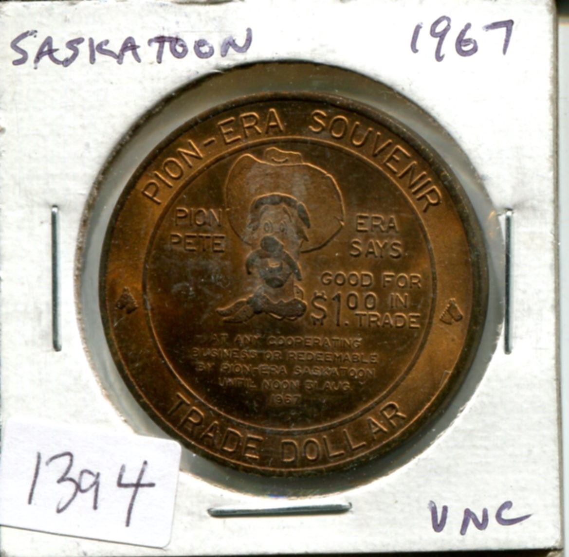 1967 Saskatoon Trade Dollar celebrates Canada’s Centennial. Unc. Nice.