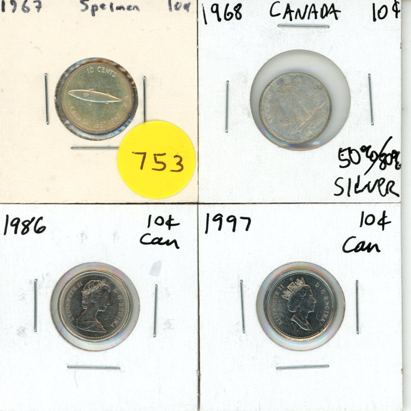 1967 (Silver), 1968 (50% Silver), 1986, 1997 Canadian Ten Cents Coins.