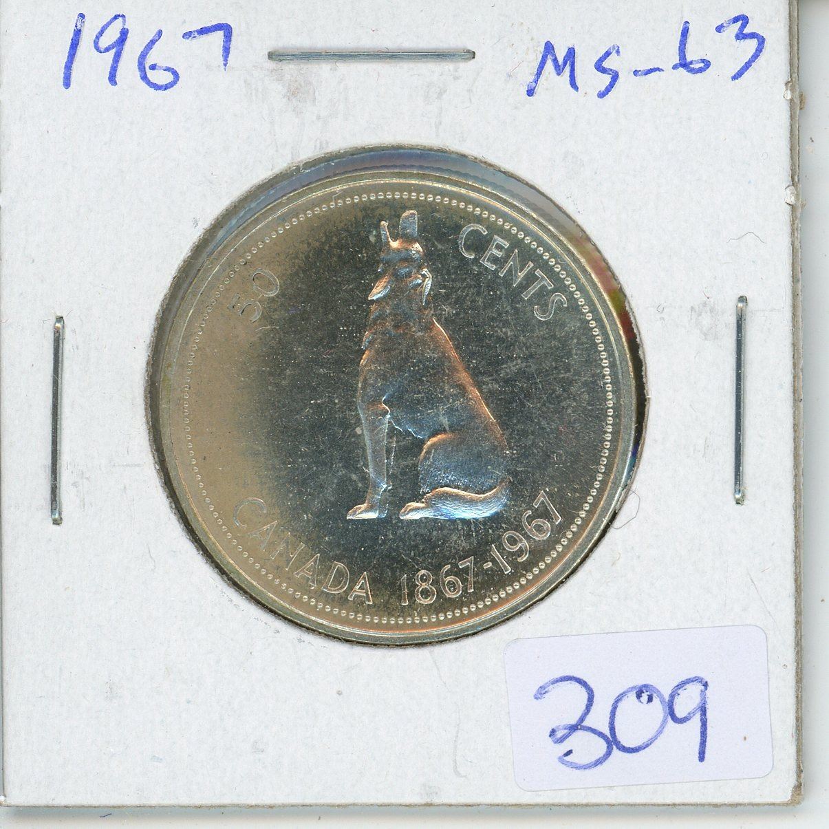 1967 Silver 50 Cents. Centennial Howling Wolf. MS-63. Lightly Toned. Nice.