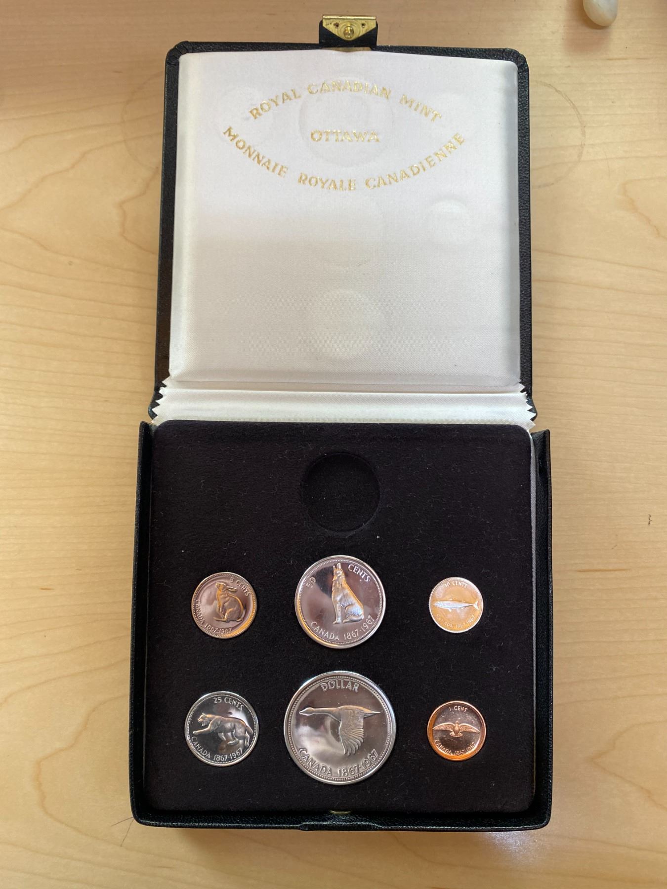 1967 Specimen $20 gold set (no gold). Contains the 1 cent, 5 cents, 10 cents, 25 cents, 50 cents and silver dollar, all in Specimen finish. Housed in original black leather presentation case. All coins are brilliant.