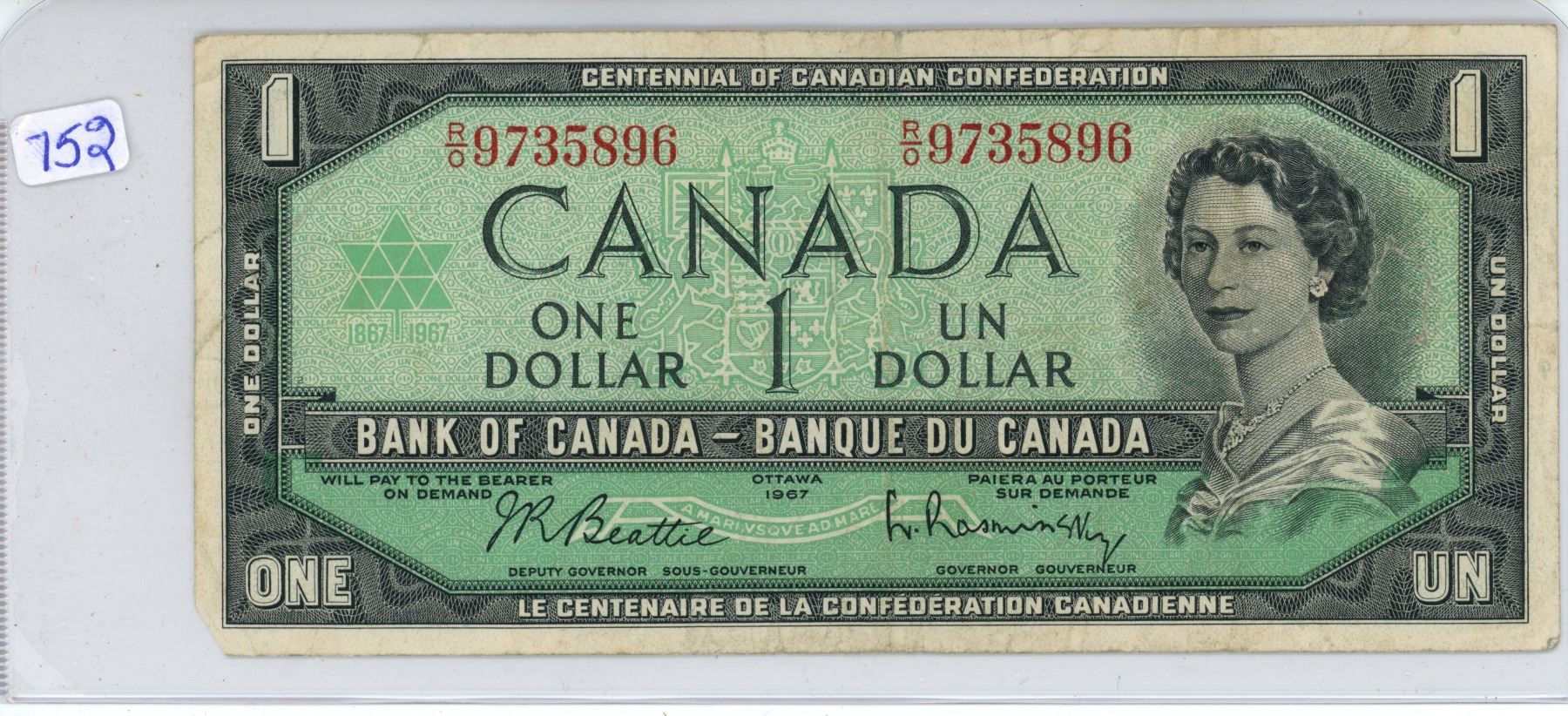1967 canada $1 billbeattie/ rasminsky0 #R/O 9735896