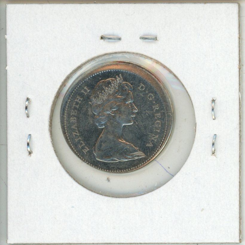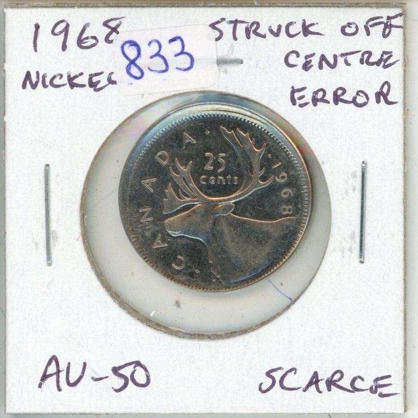 1968 25 Cents Struck Off Centre. The Obverse is even more spectacular. Made of Nickel. AU-50 Scarce.