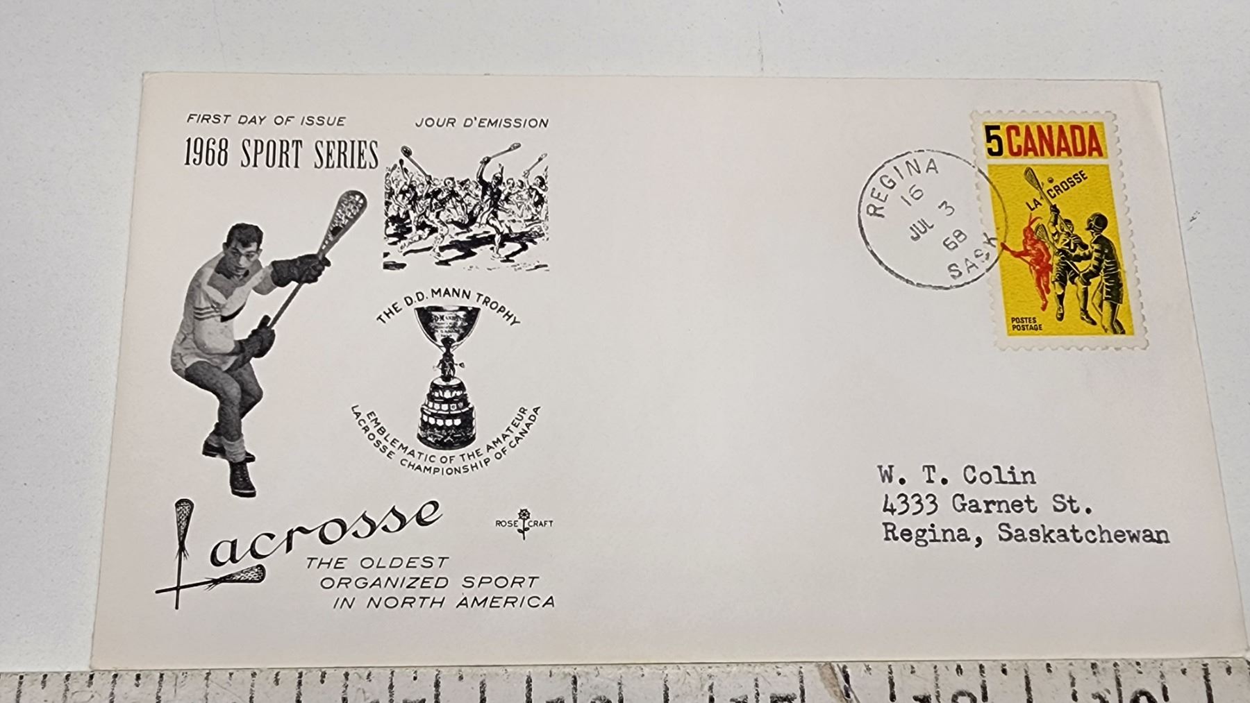 1968 5 Cents First Day Cover. 1968 Sports Series: Lacrosse, the oldest organized sport in North America.