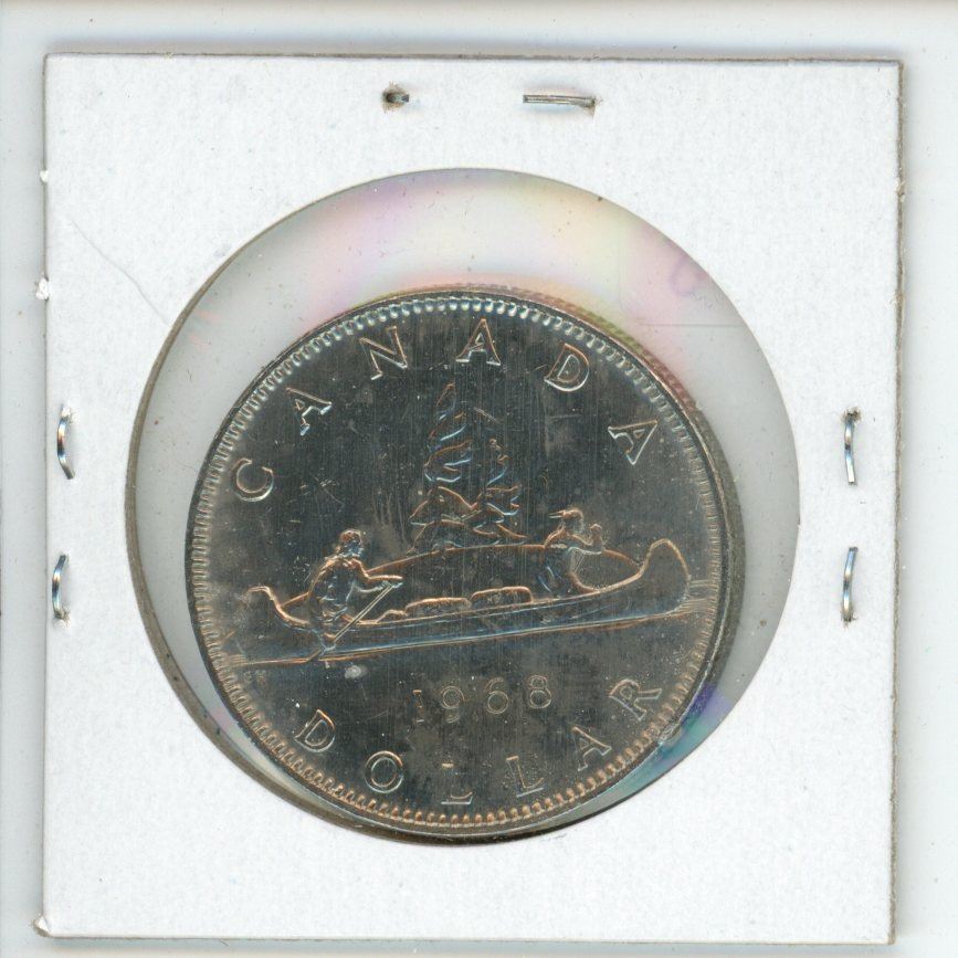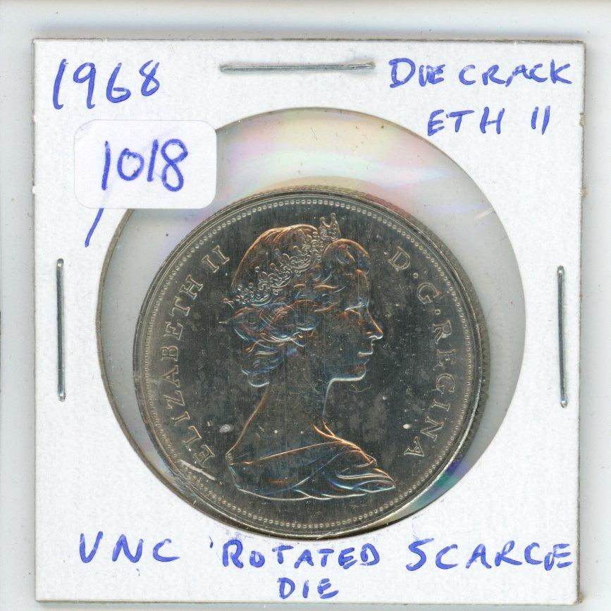 1968 Canadian Nickel Dollar. There is a Die Crack at ETH II. Uncirculated with Rotated Die. Scarce.