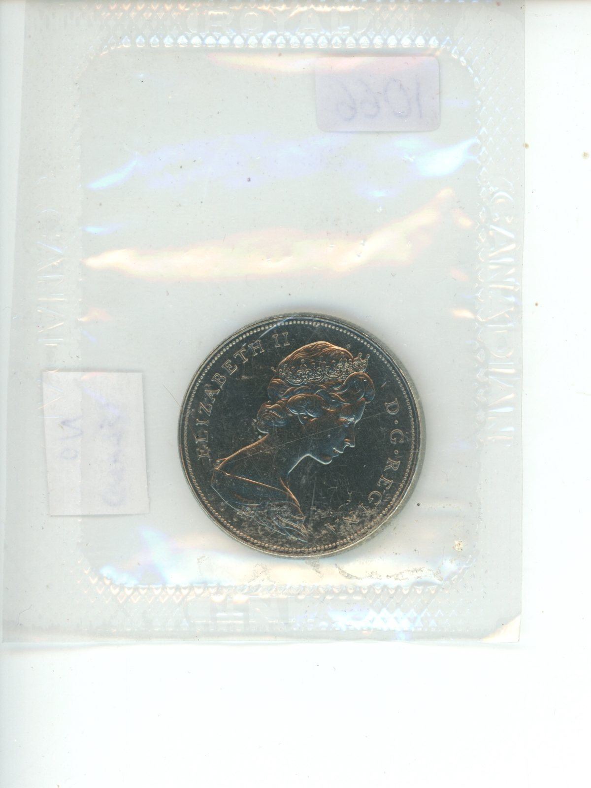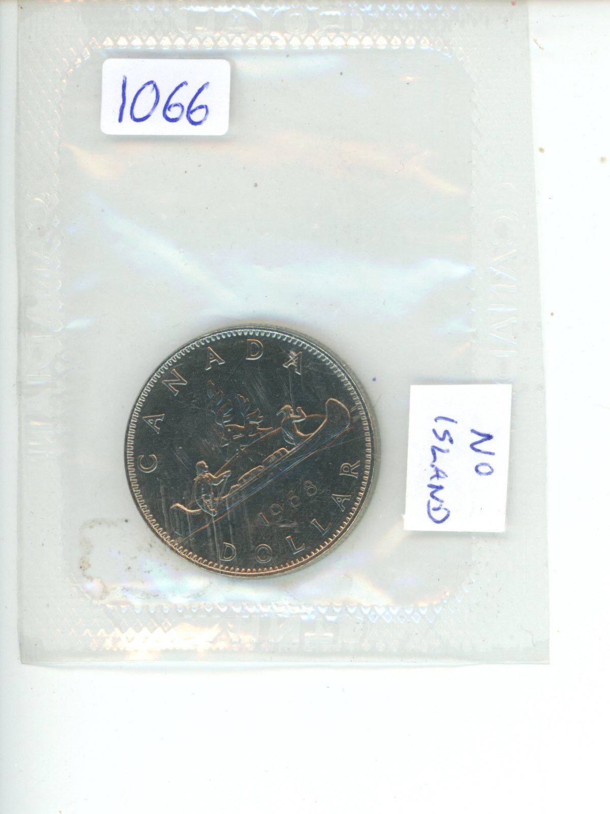1968 Canadian Nickel Dollar with No Island in front of canoe. Housed in its original Royal Canadian Mint packaging.