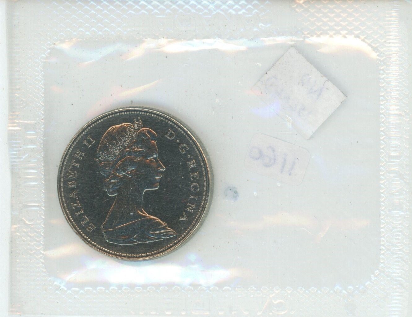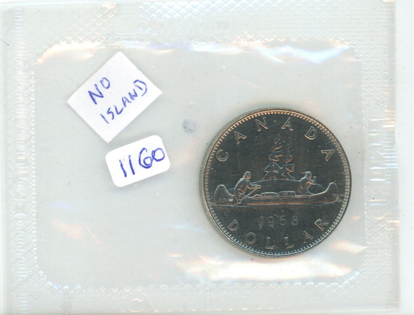 1968 No Island Canadian Nickel Dollar. Housed in its original Royal Canadian Mint plastic. Scarce.