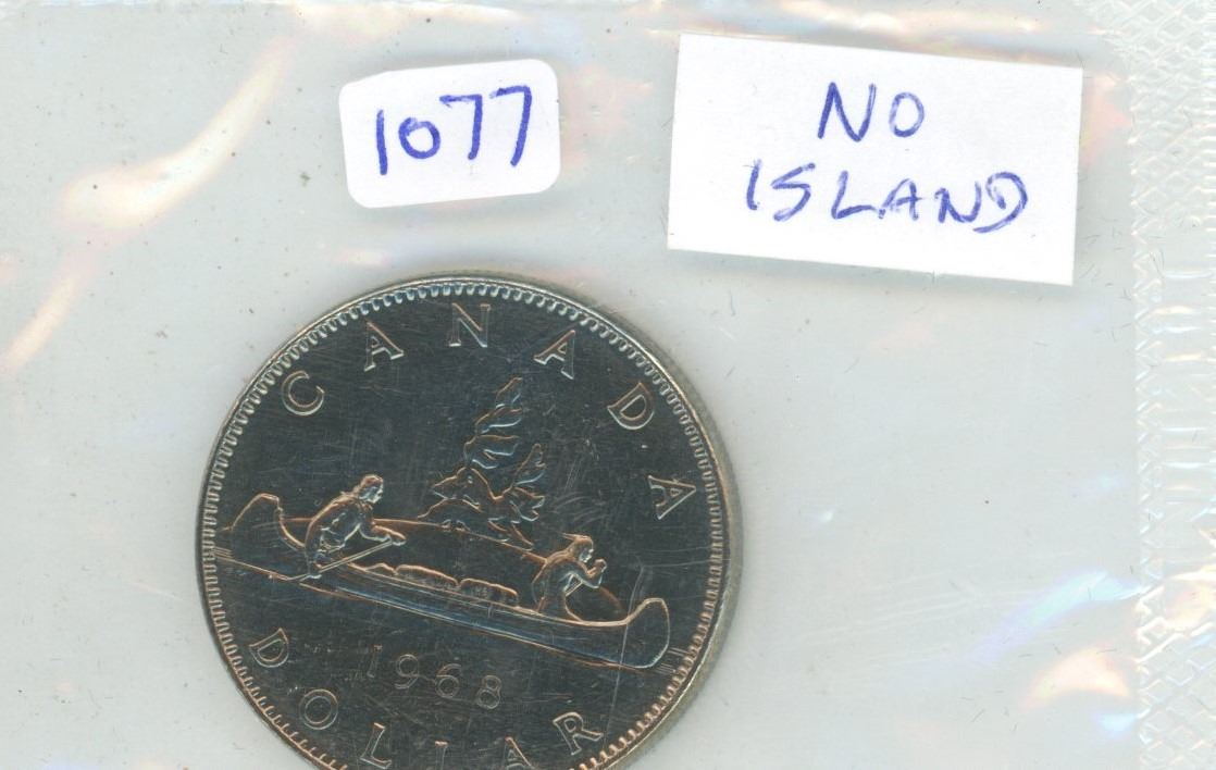 1968 No Island Nickel Dollar. No Island in front of the canoe. Still housed in its original Royal Canadian Mint plastic.