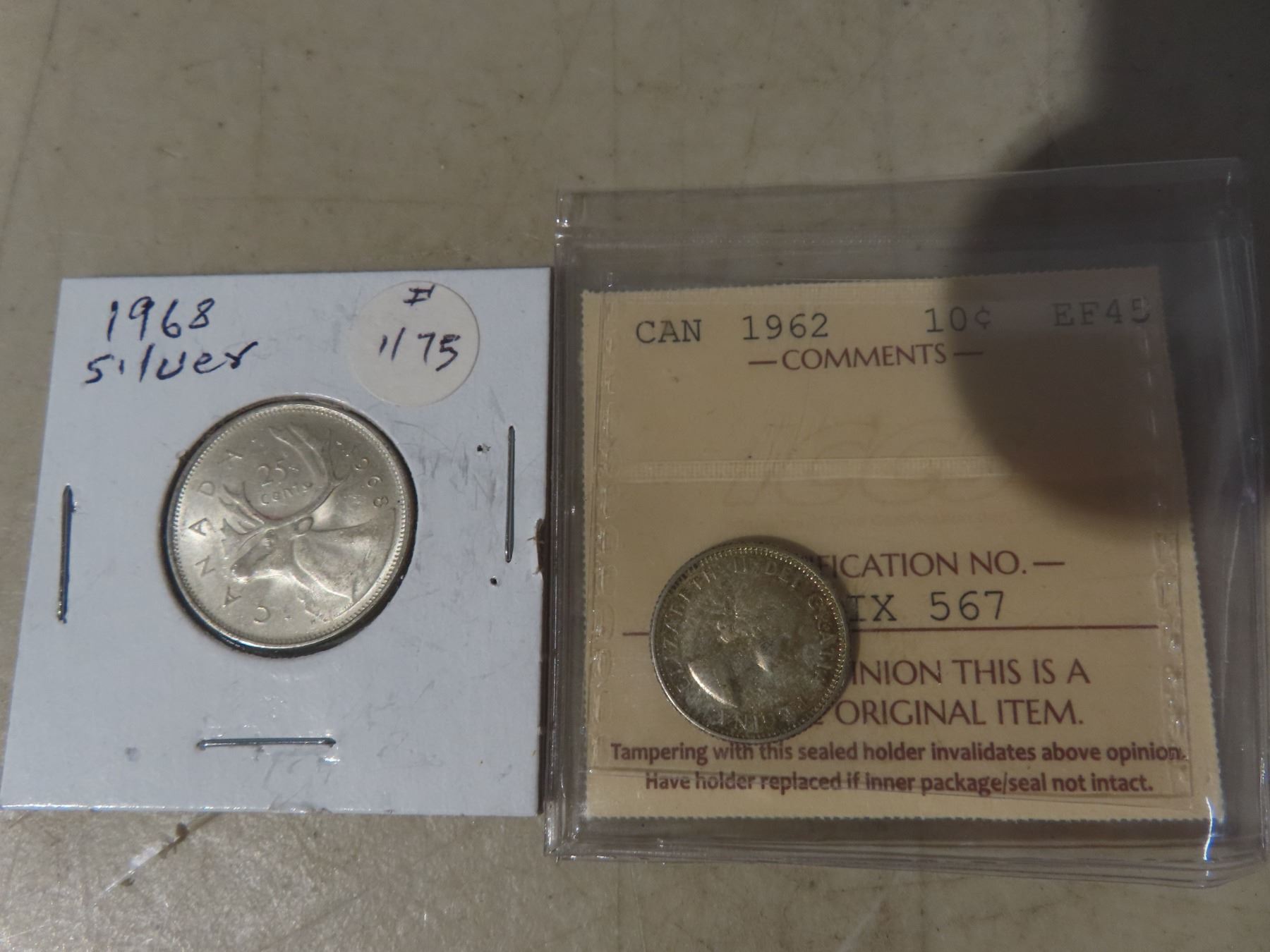 1968 silver 25 cent, 1962 silver 10 cents, 26-SN8-27 sterling ring and 2 pins)