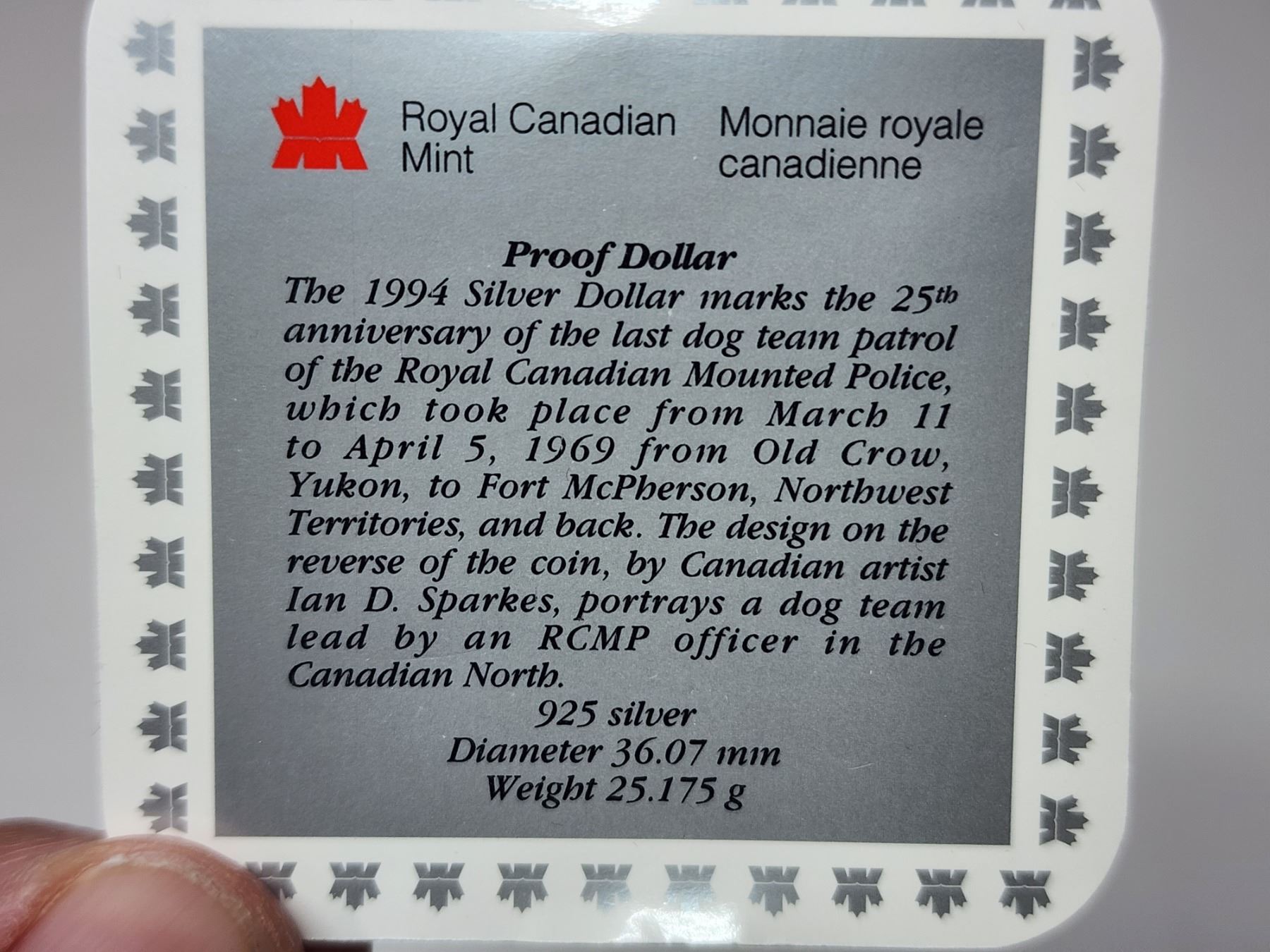 1969-1994 Canada Sterling Silver Proof Dollar, RCMP Dog Patrol, COA