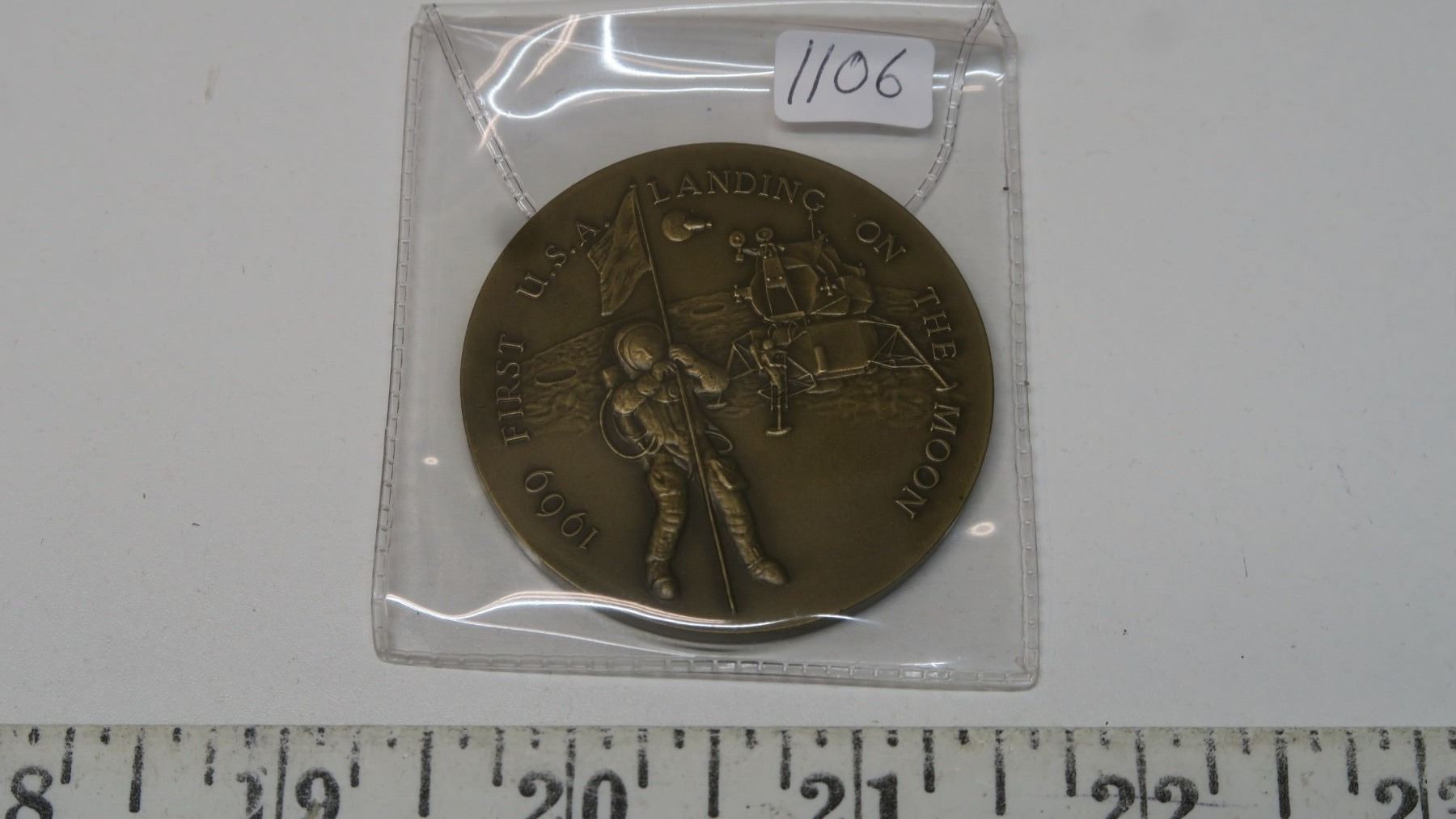1969 Apollo XI antique brass medal. Large First Moon Landing medal. BU.