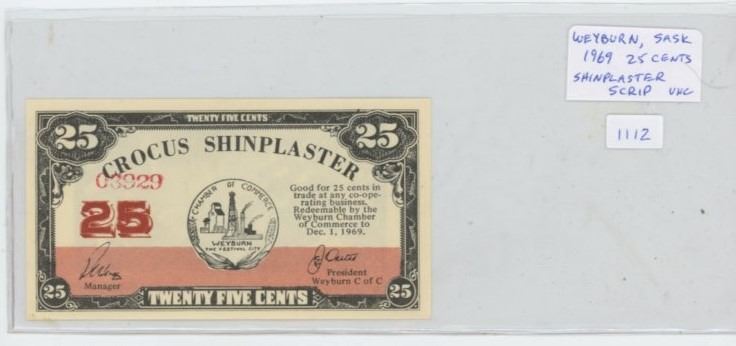1969 Weyburn, Saskatchewan 25 cents Shinplaster Scrip. Unc. Nice.