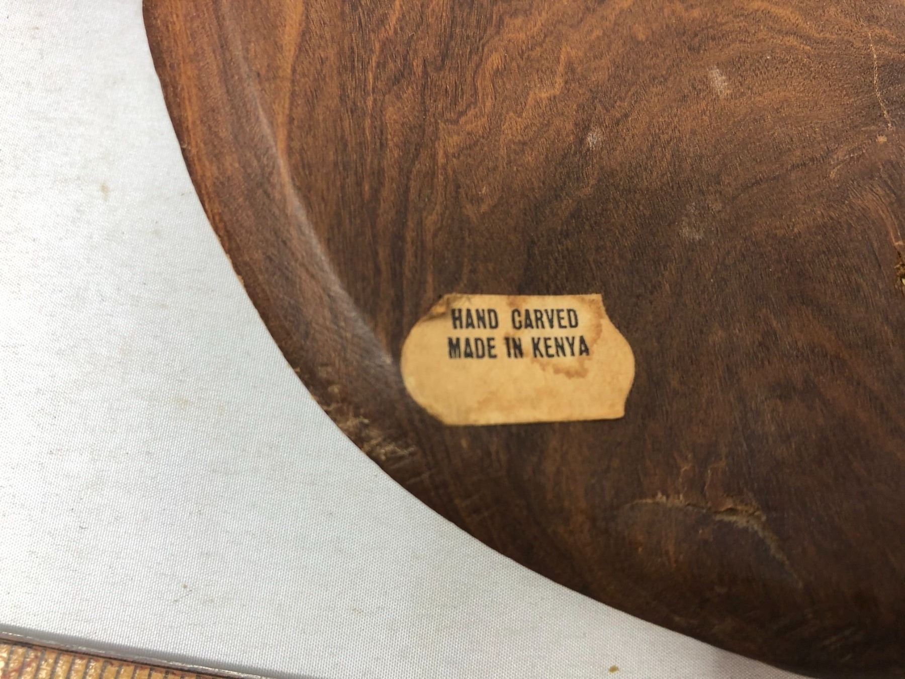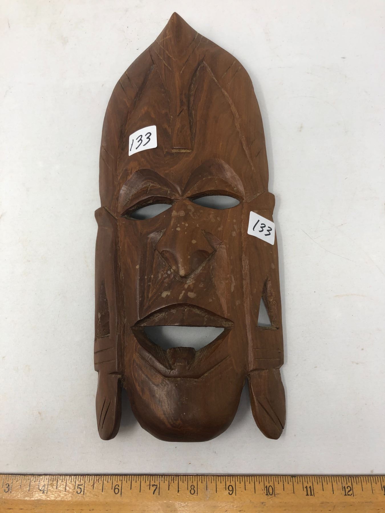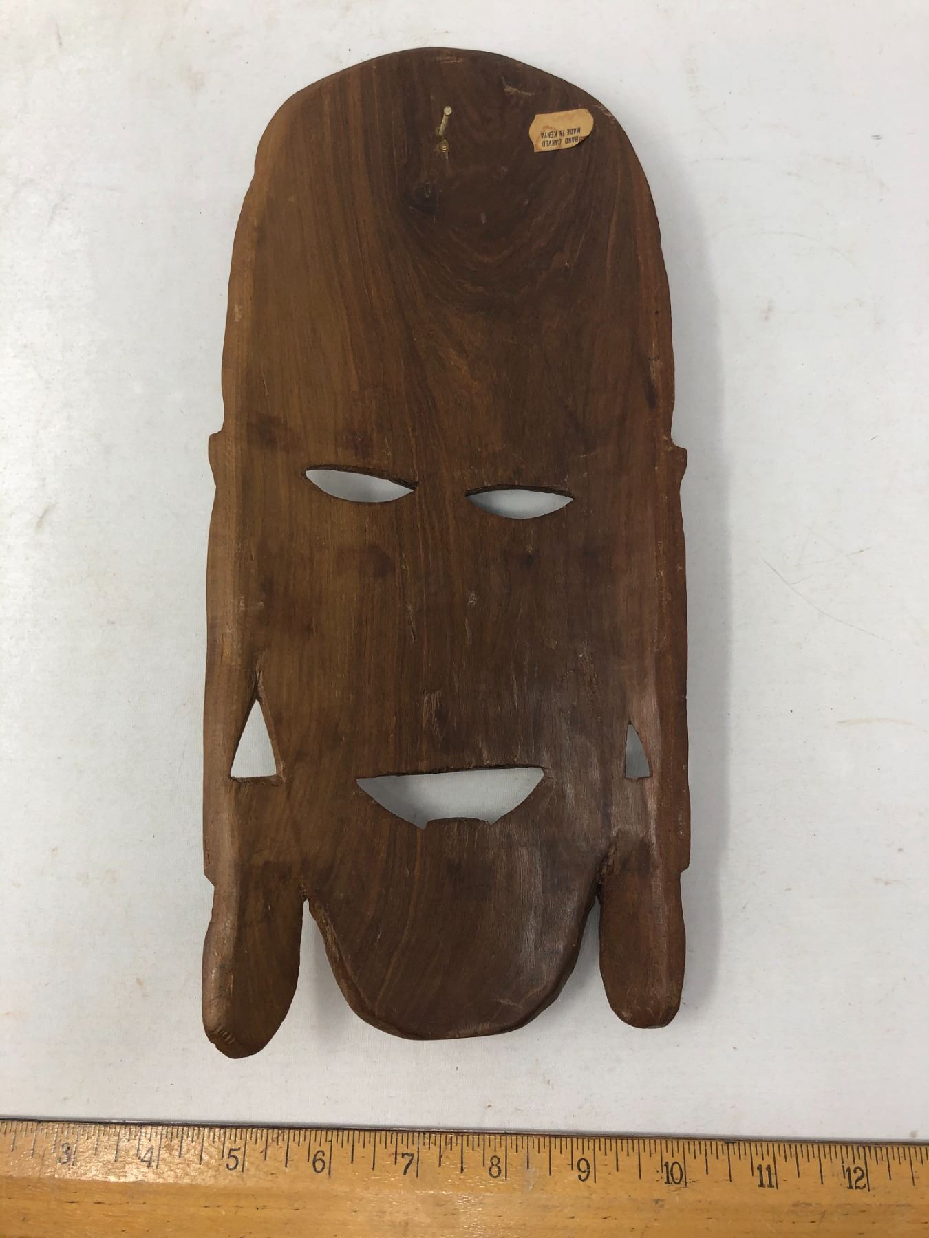 1970 hand carved Kenya wood mask. Wearable with holes for eyes and mouth. Height: 13”.