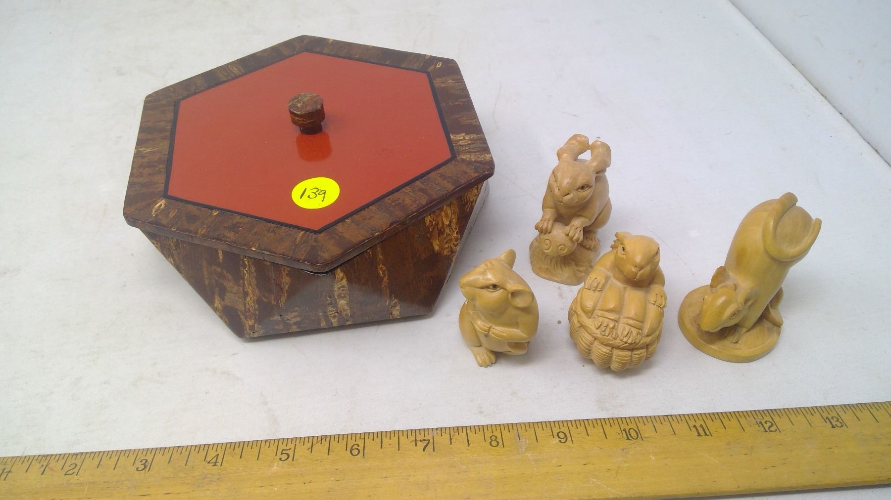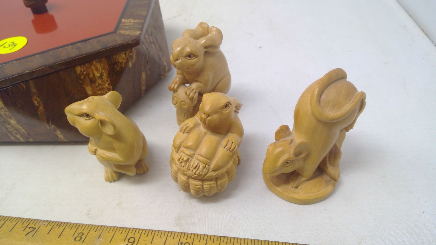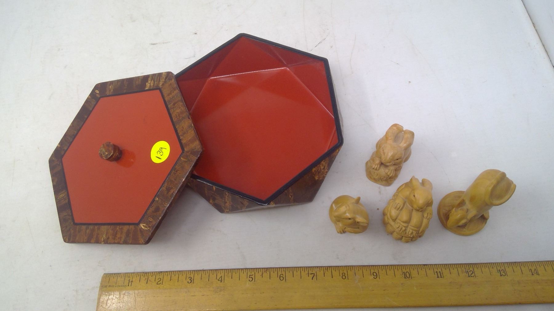 1970 Japan Octagonal Gravity Lidded Laequerware Box with 4 Netsuke Hardwood Mice