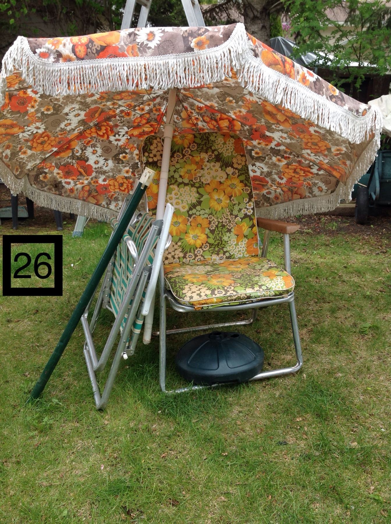 1970'S OUTDOOR UMBRELLA AND FOLDING CHAIRS.