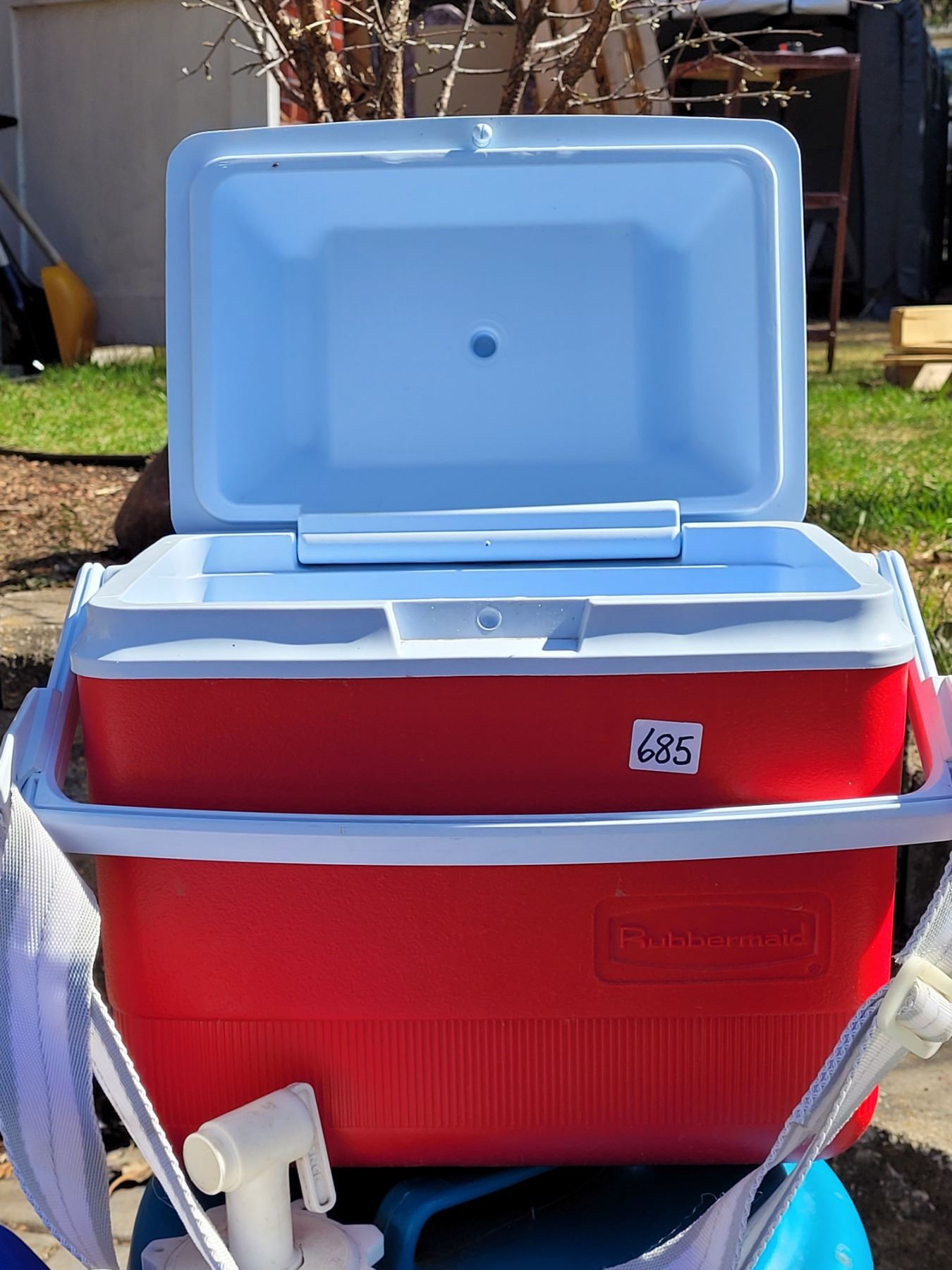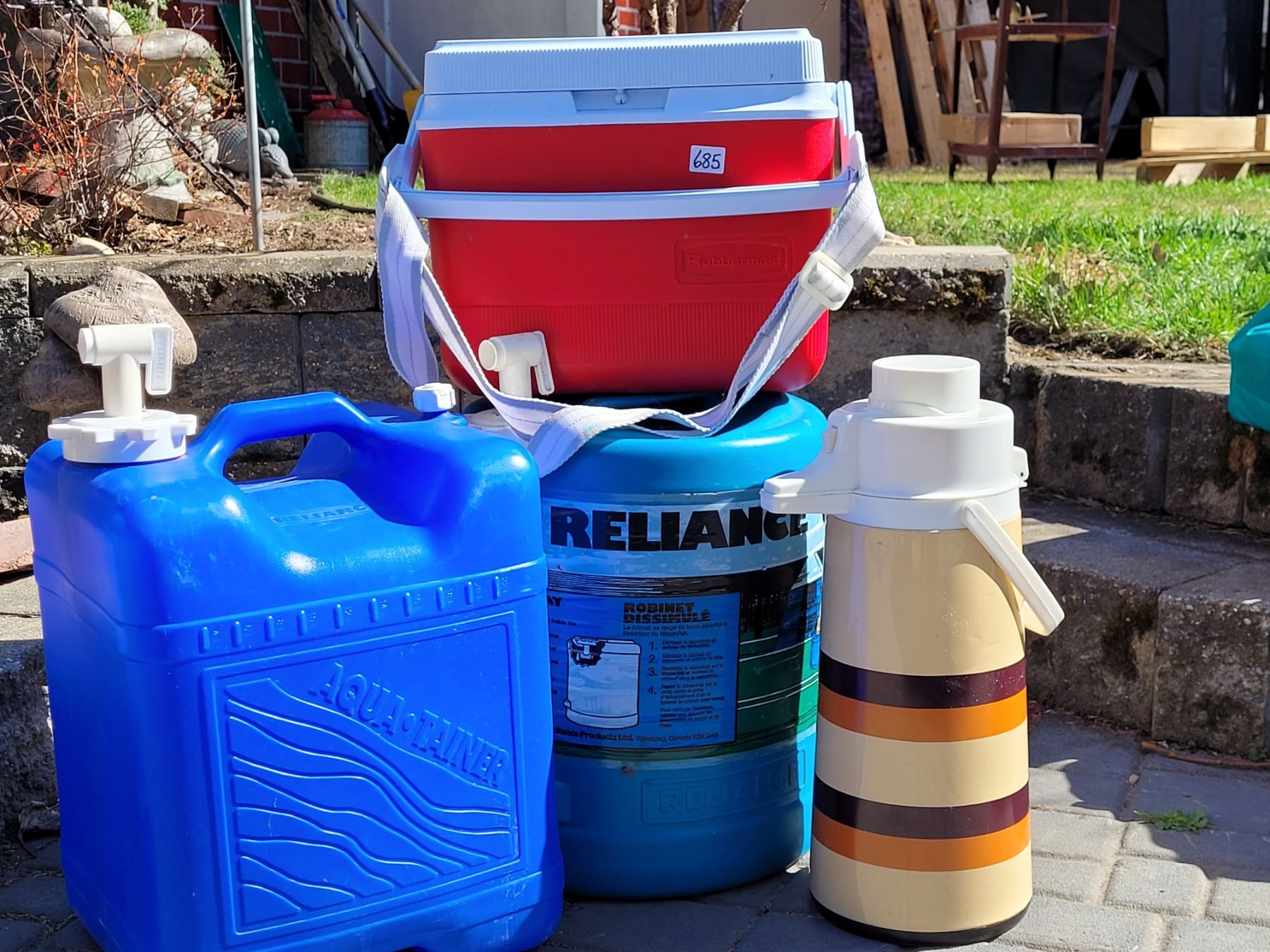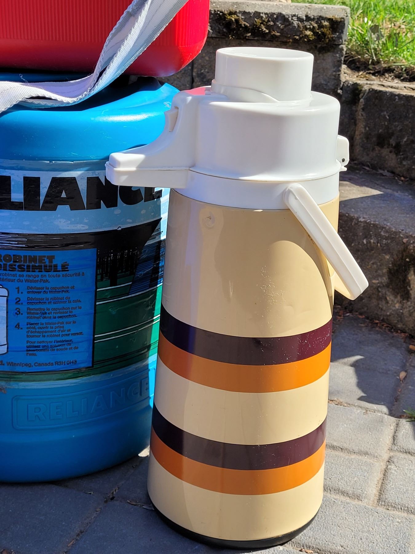 1970's Hot/ cold beverage pump. 2 Reliance water jugs with hideaway spigots. Small rubbermaid cooler.