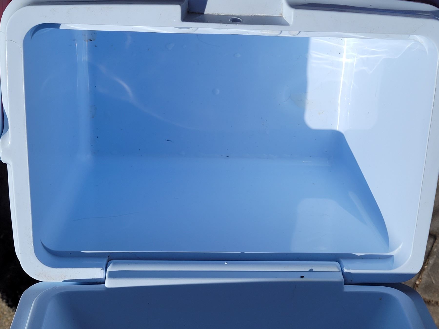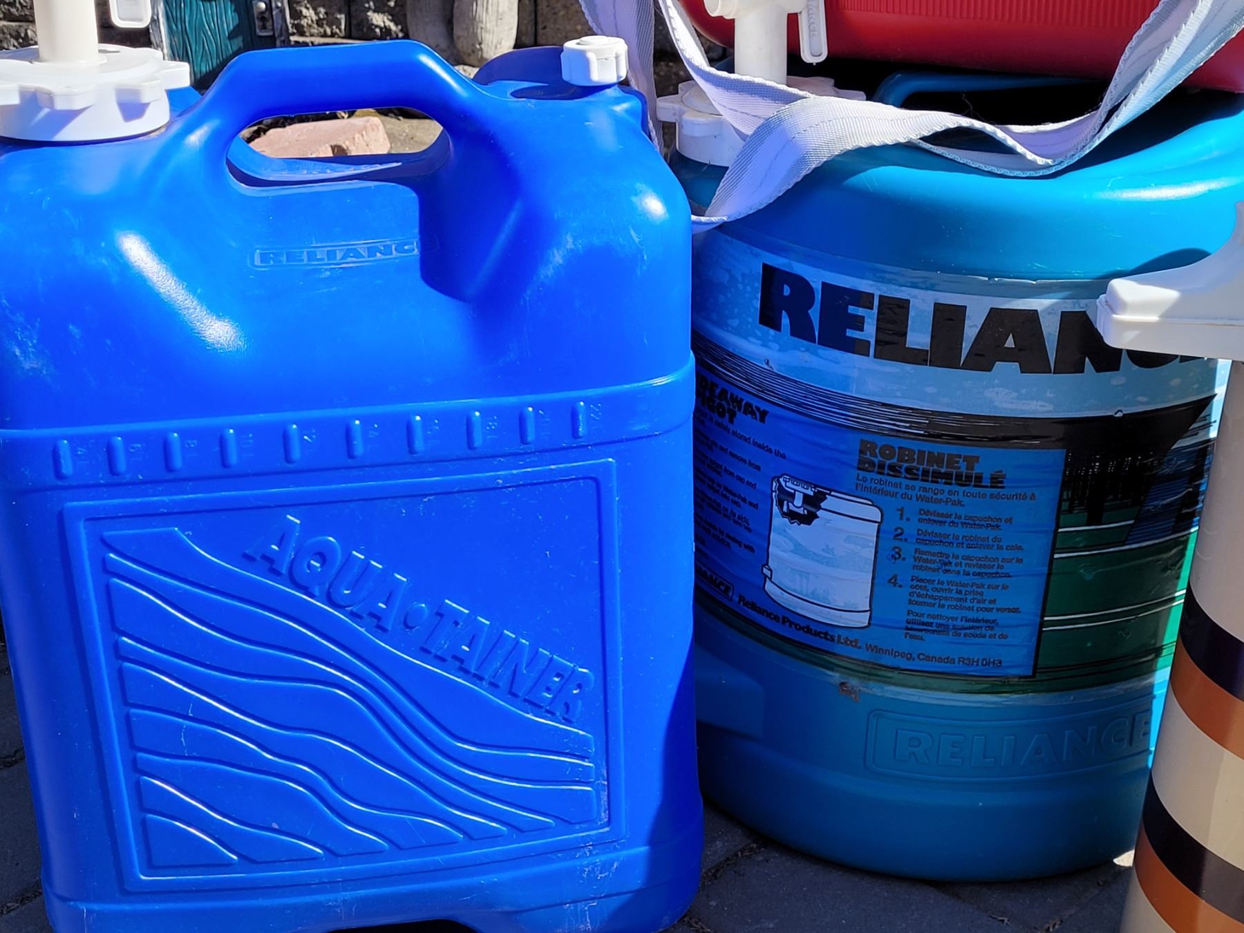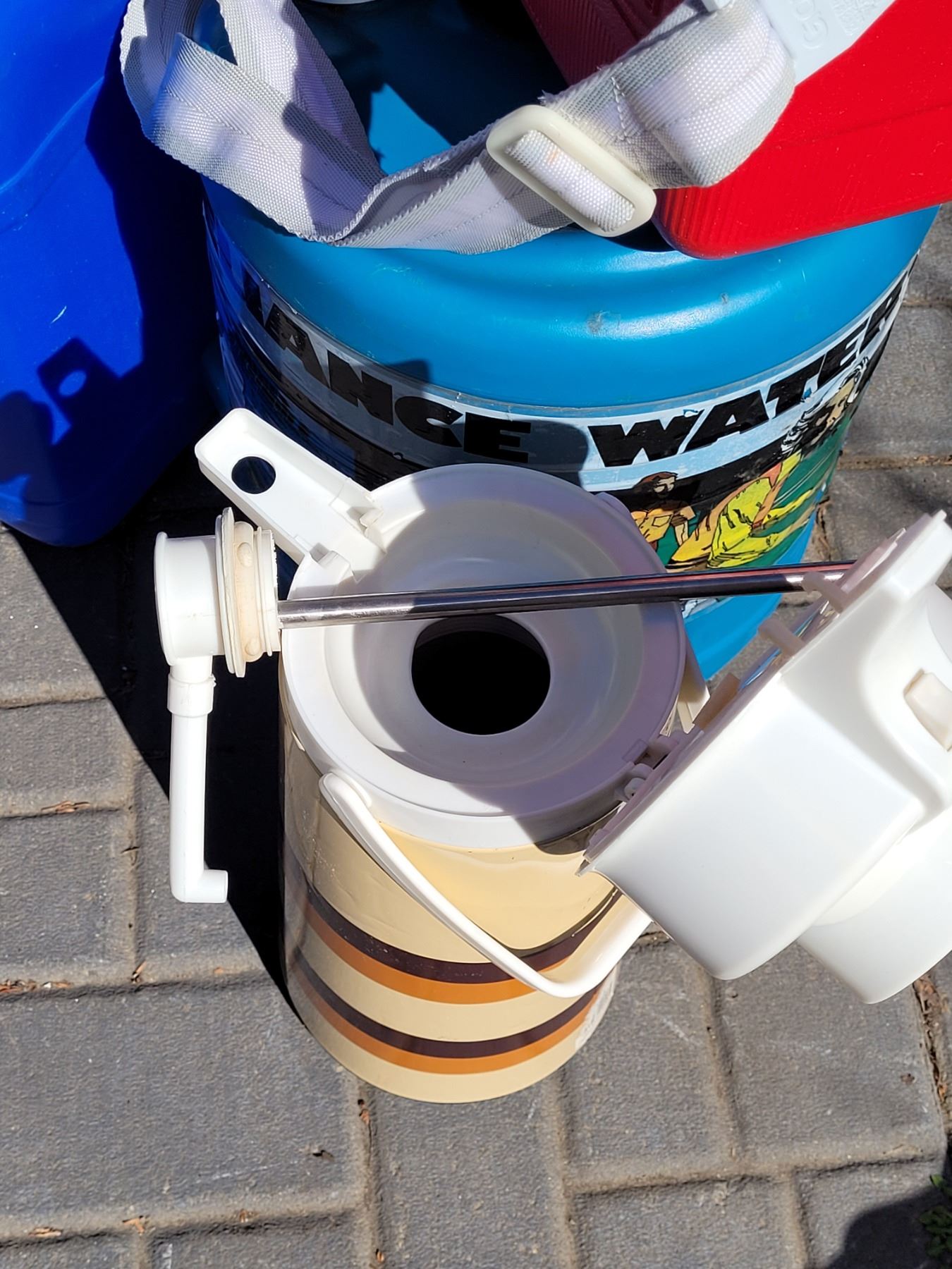 1970's Hot/ cold beverage pump. 2 Reliance water jugs with hideaway spigots. Small rubbermaid cooler.