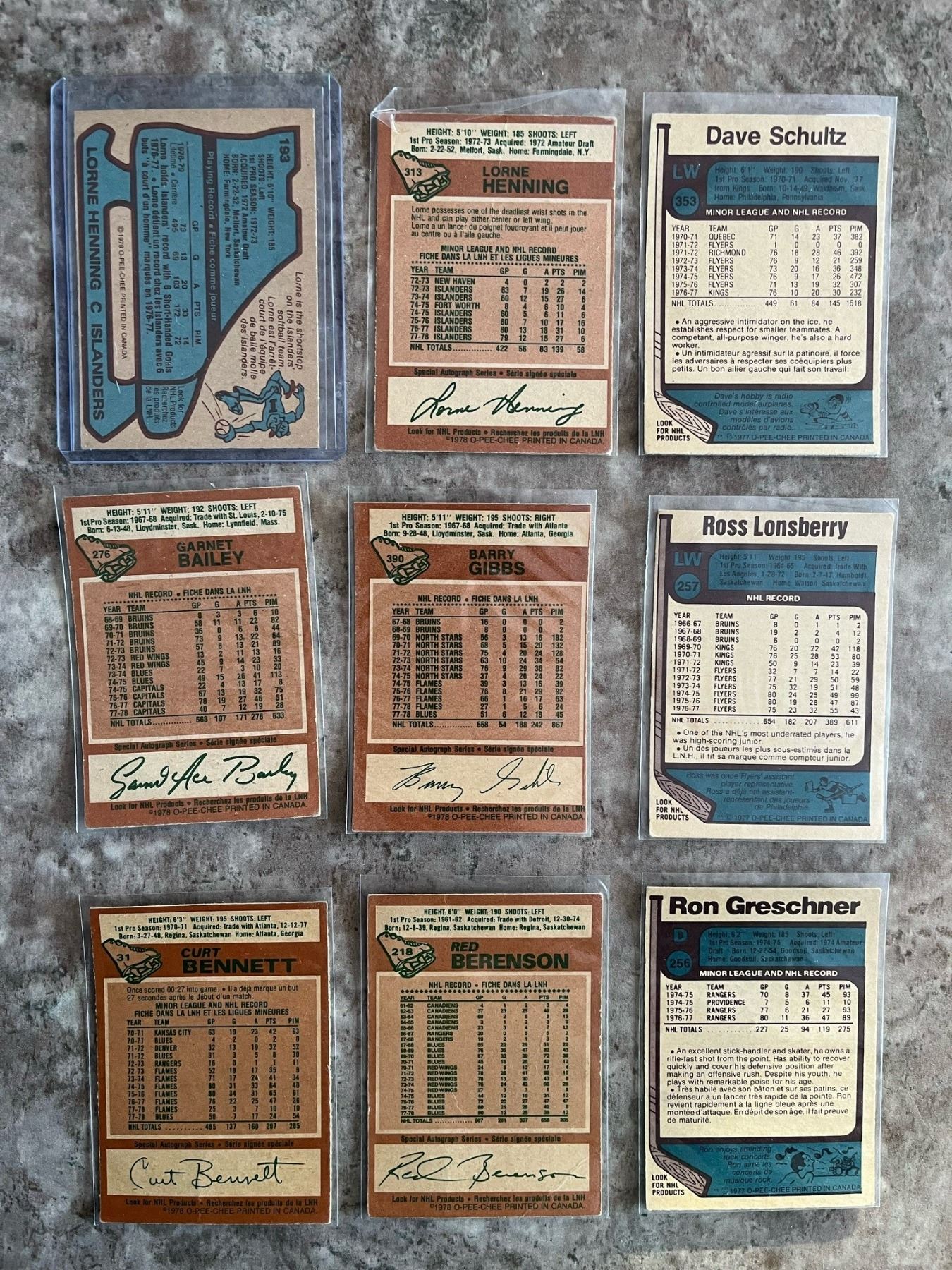 1970s lot of 9 O Pee Chee (OPC) hockey cards. All guys from Sask. Lorne Henning from Melfort. Dave Schultz from Waldheim.
