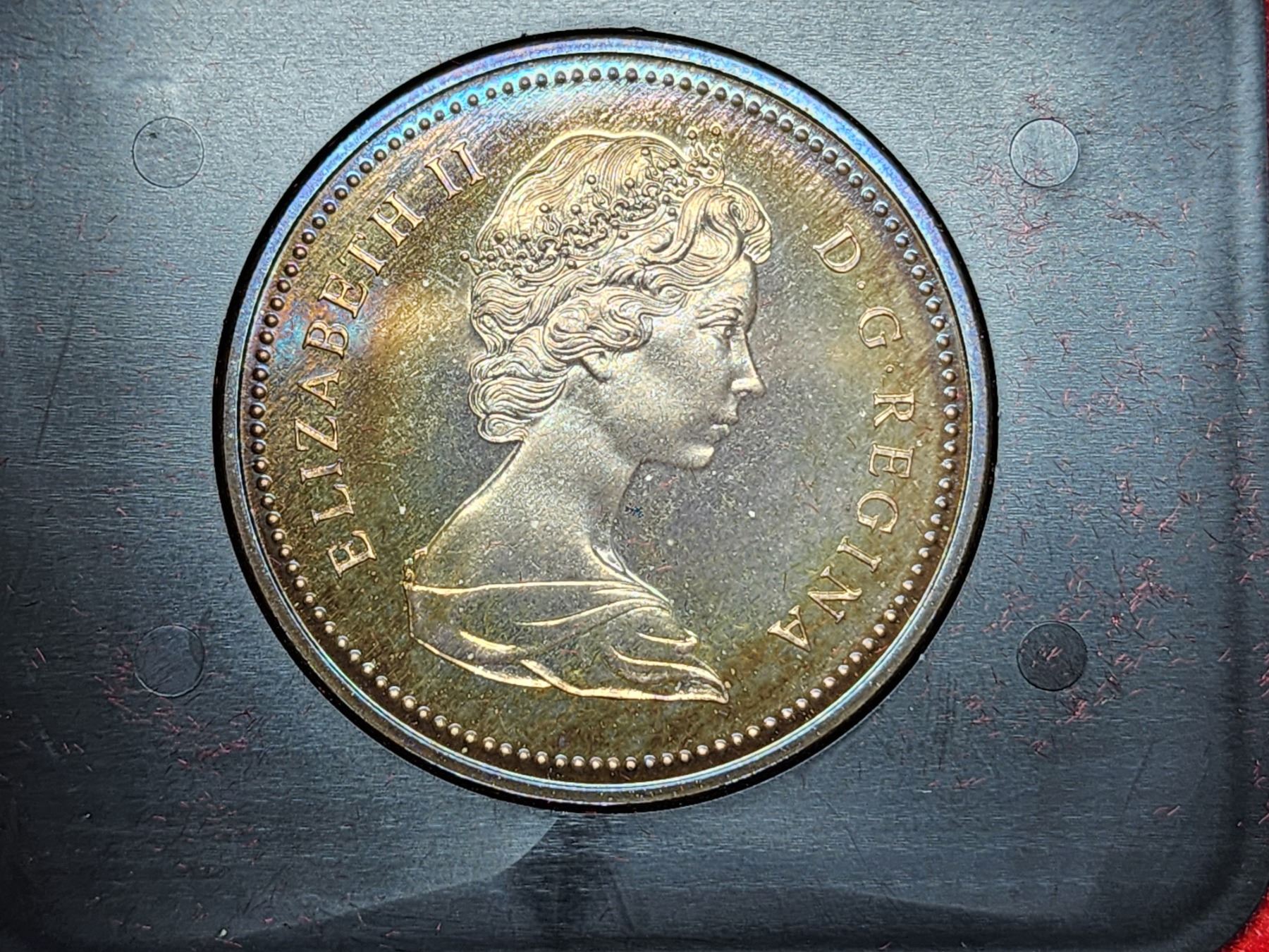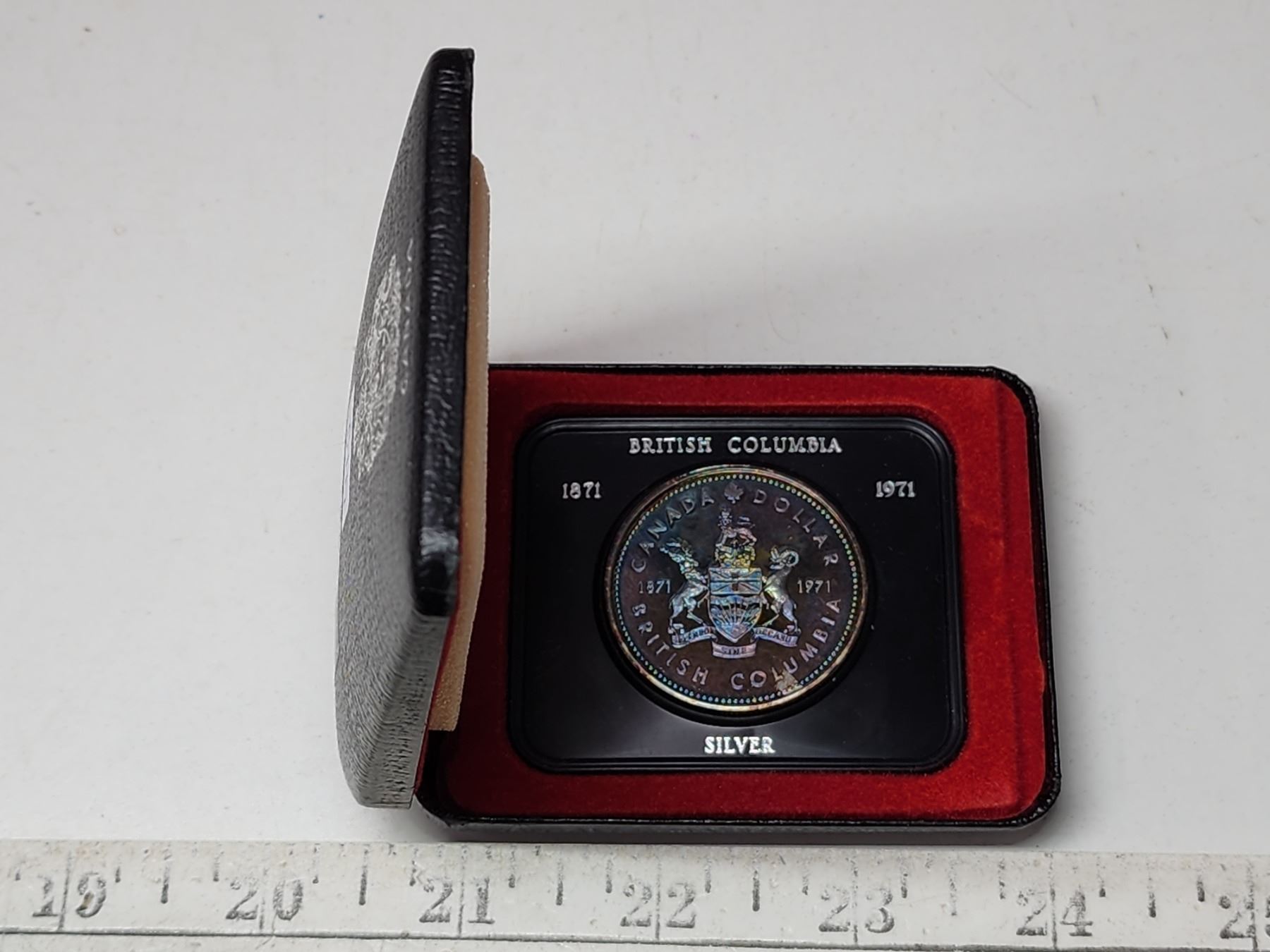 1971 British Columbia Centennial Silver Dollar. Specimen. Beautifully Toned. Housed in its original black case of issue.