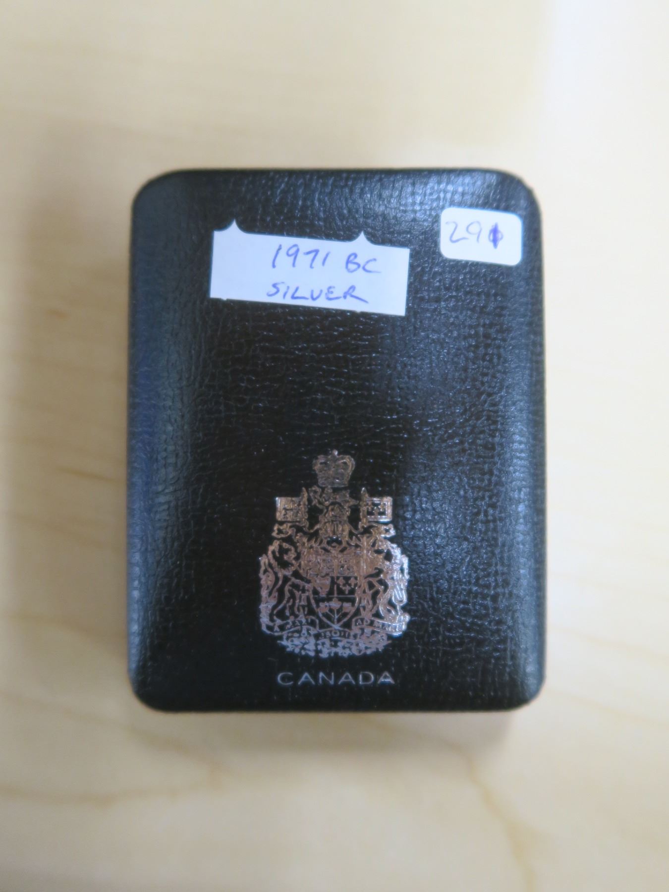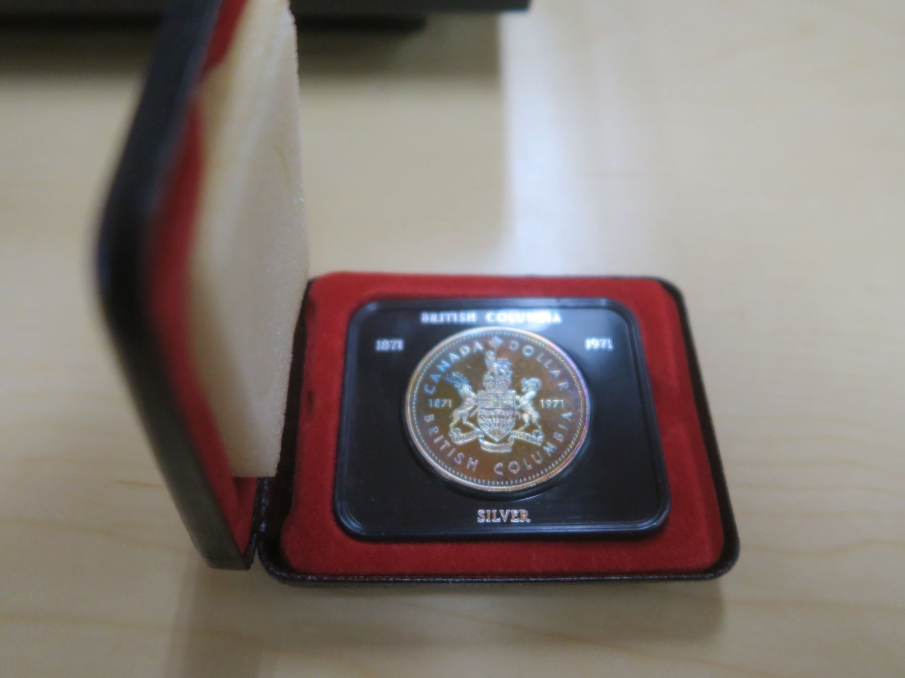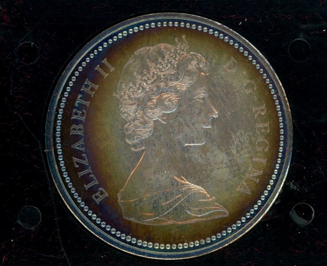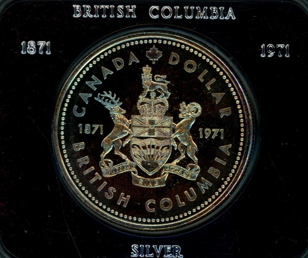 1971 British Columbia Centennial Silver Dollar. Specimen. Nicely Toned. Housed in its original Royal Canadian Mint black clamshell case.