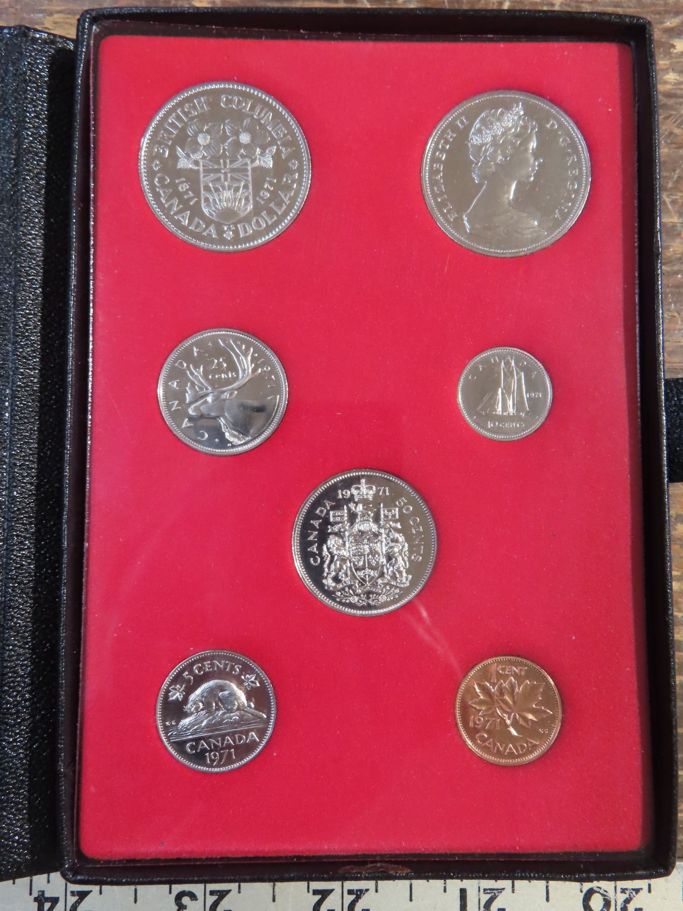 1971 Double Dollar Specimen Set. Both nickel dollars commemorate the 100th Anniversary of British Columbia joining Canada in 1871. Housed in its original Royal Canadian Mint case of issue.
