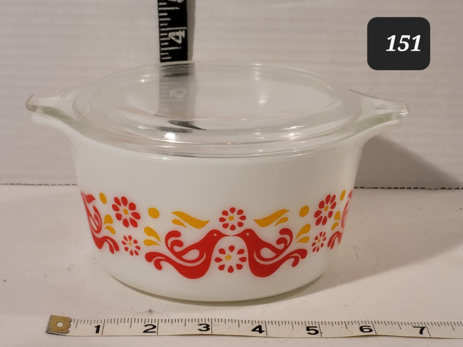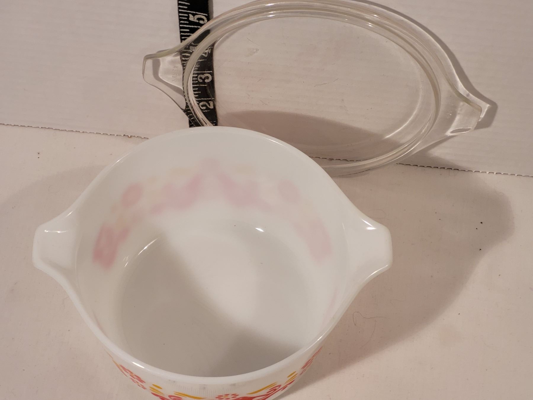 1971 Pyrex “Friendship” casserole dish. Clear lid.