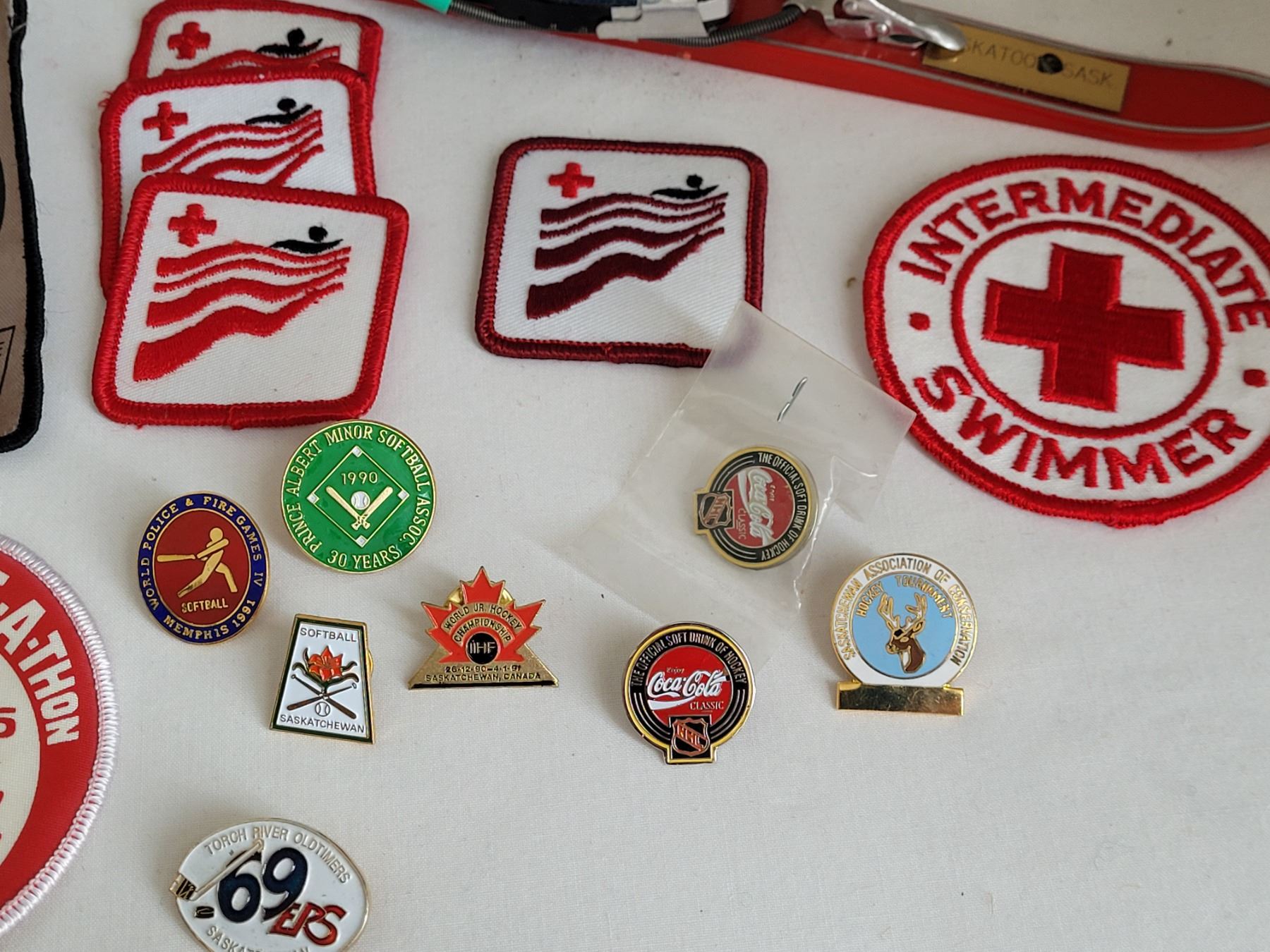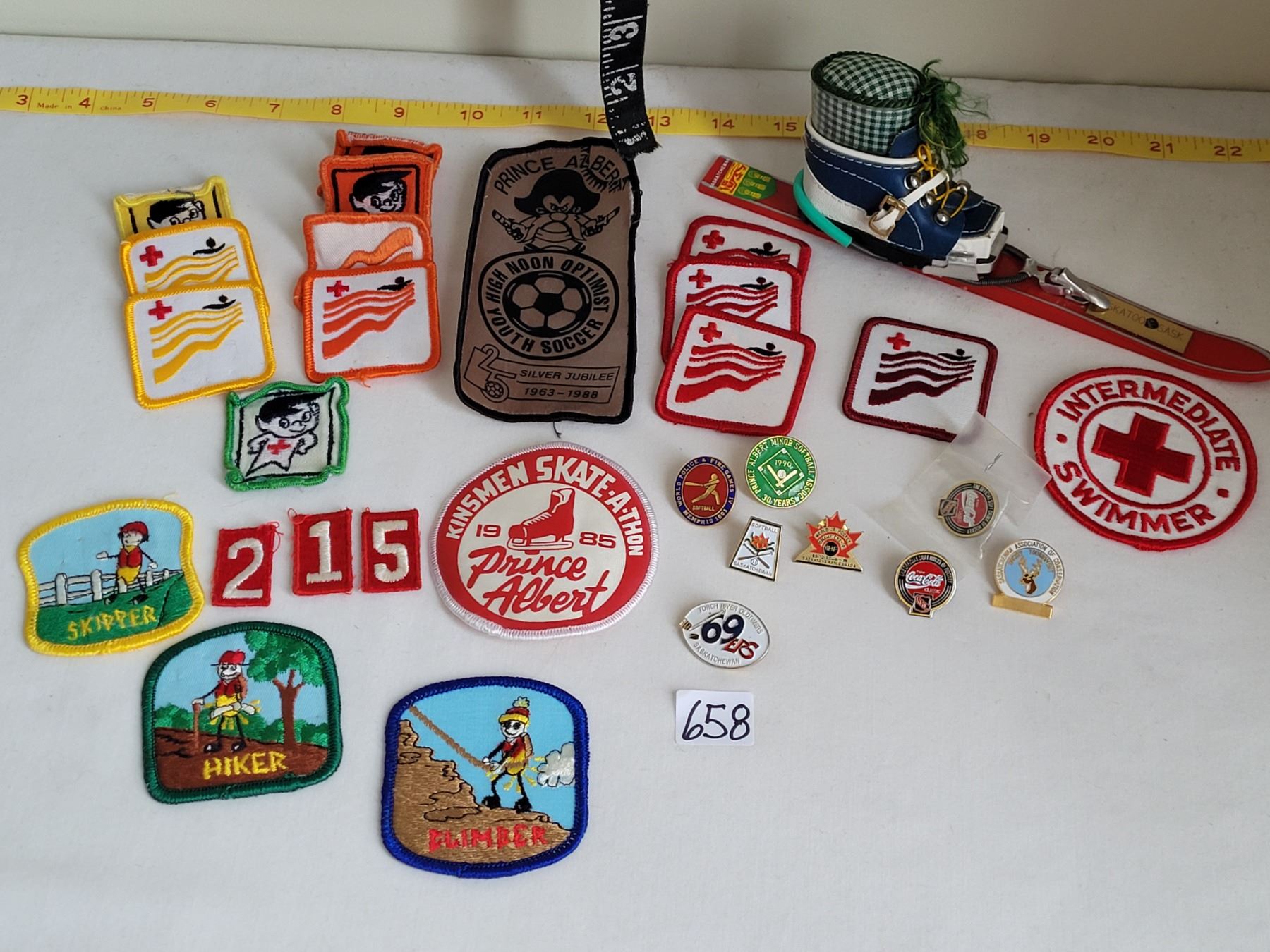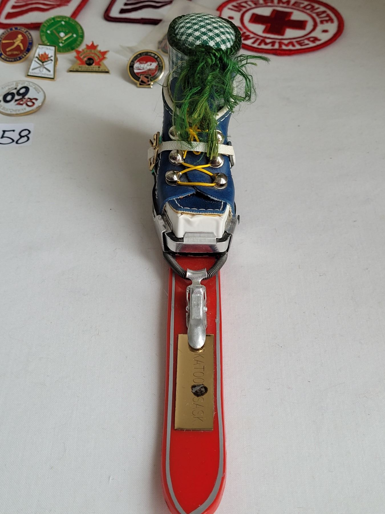 1971 Souvenir mini ski from Canadian winter games, Saskatoon Sk. Plus Mid to late century assortment of sports badges.