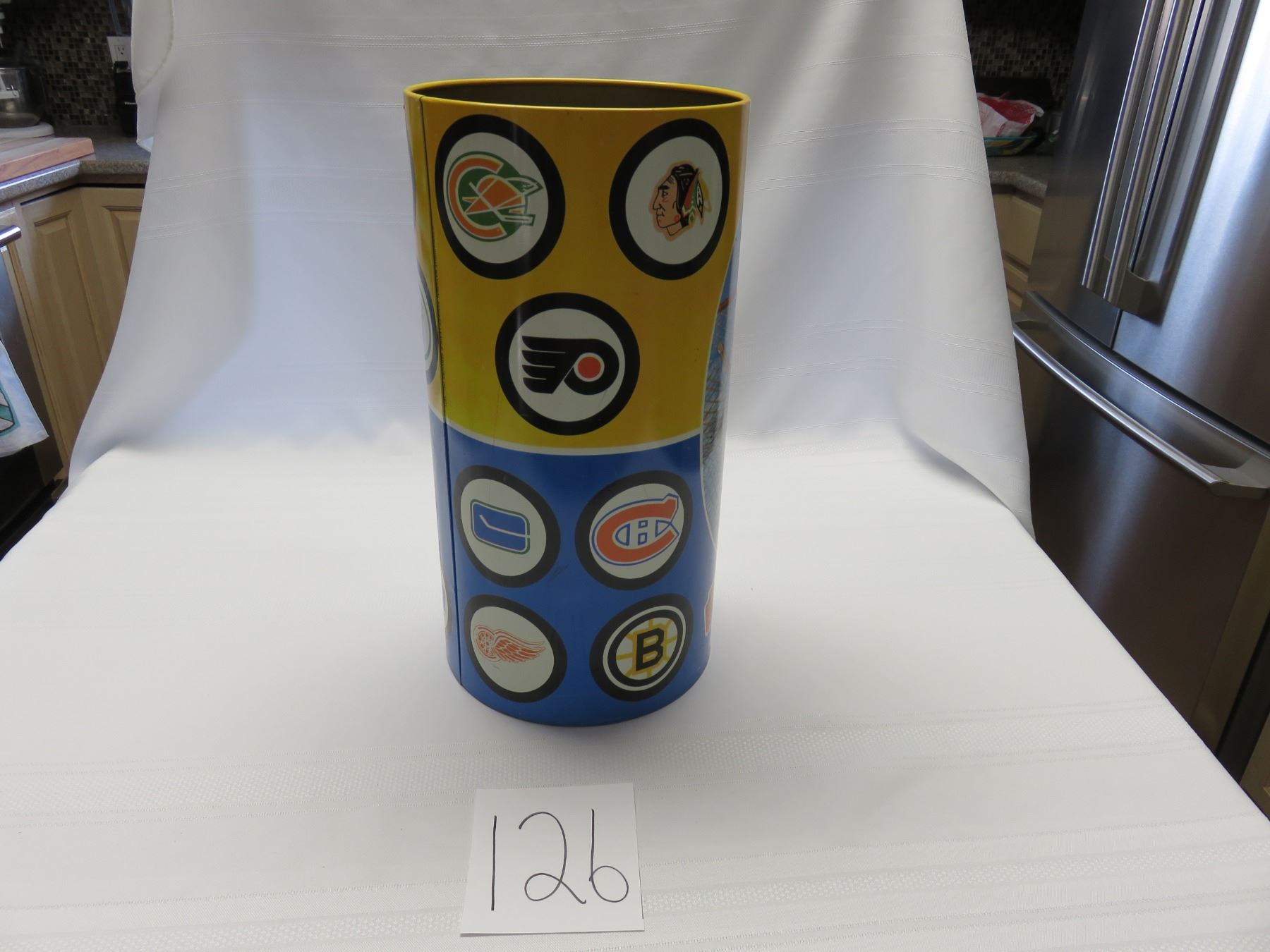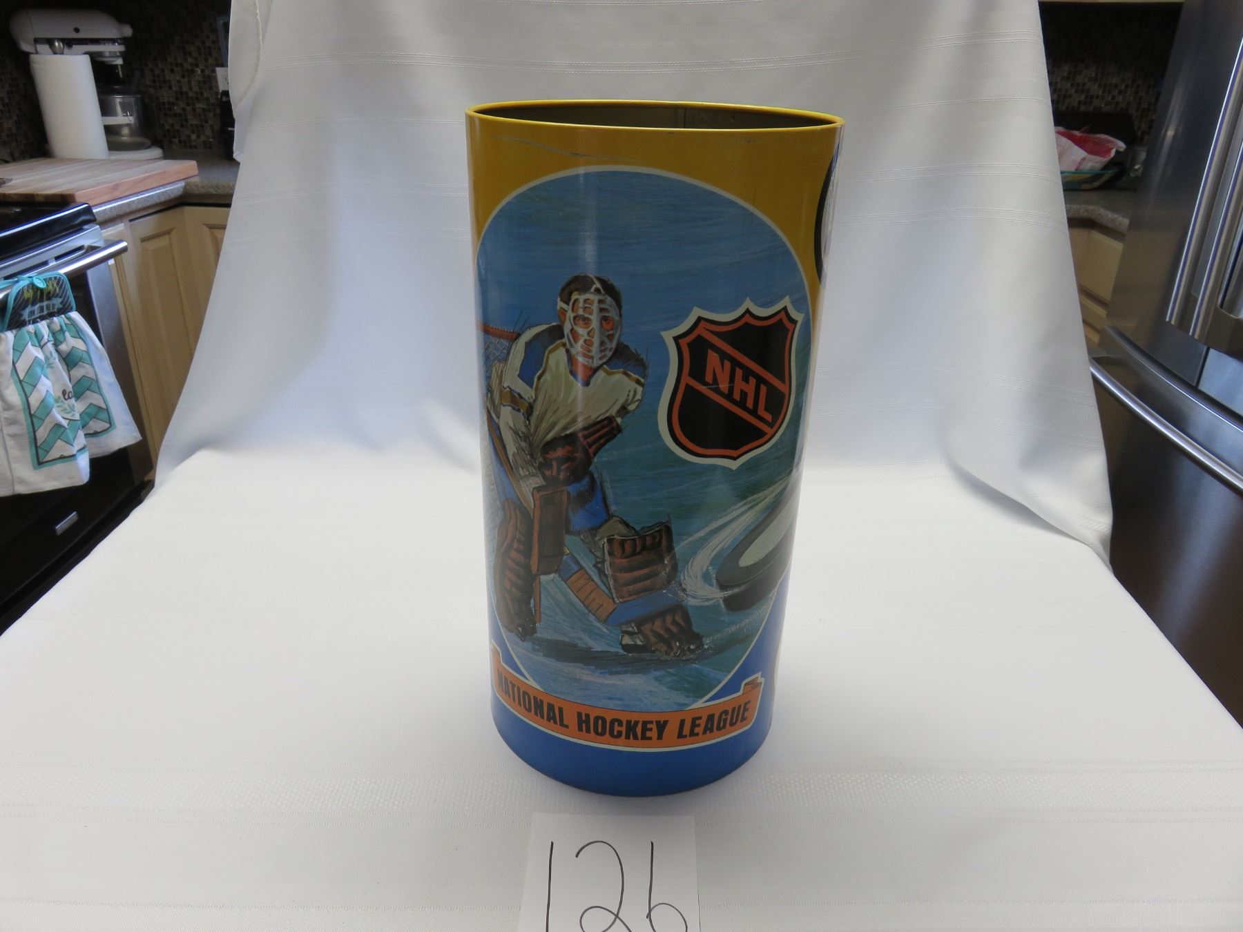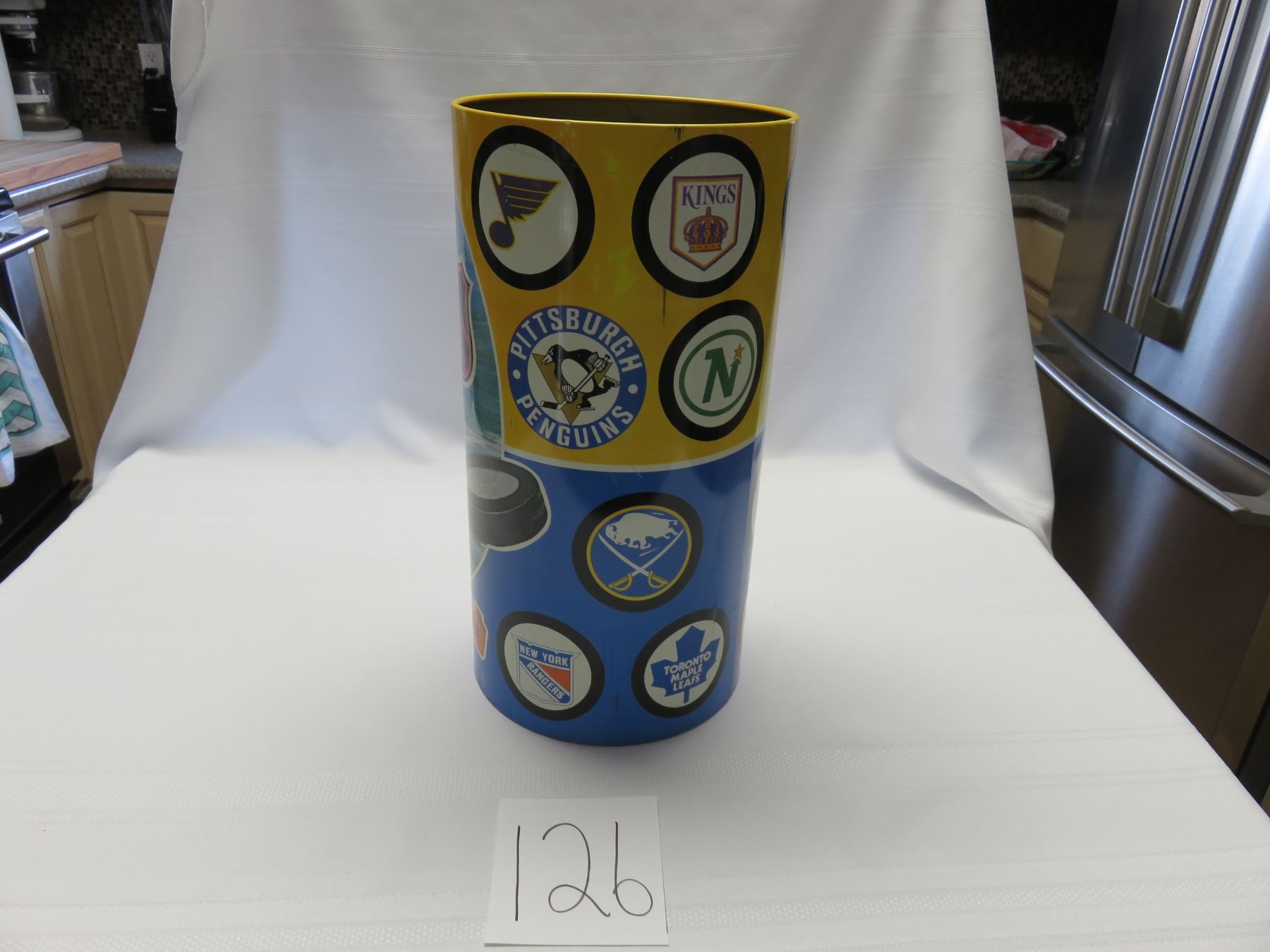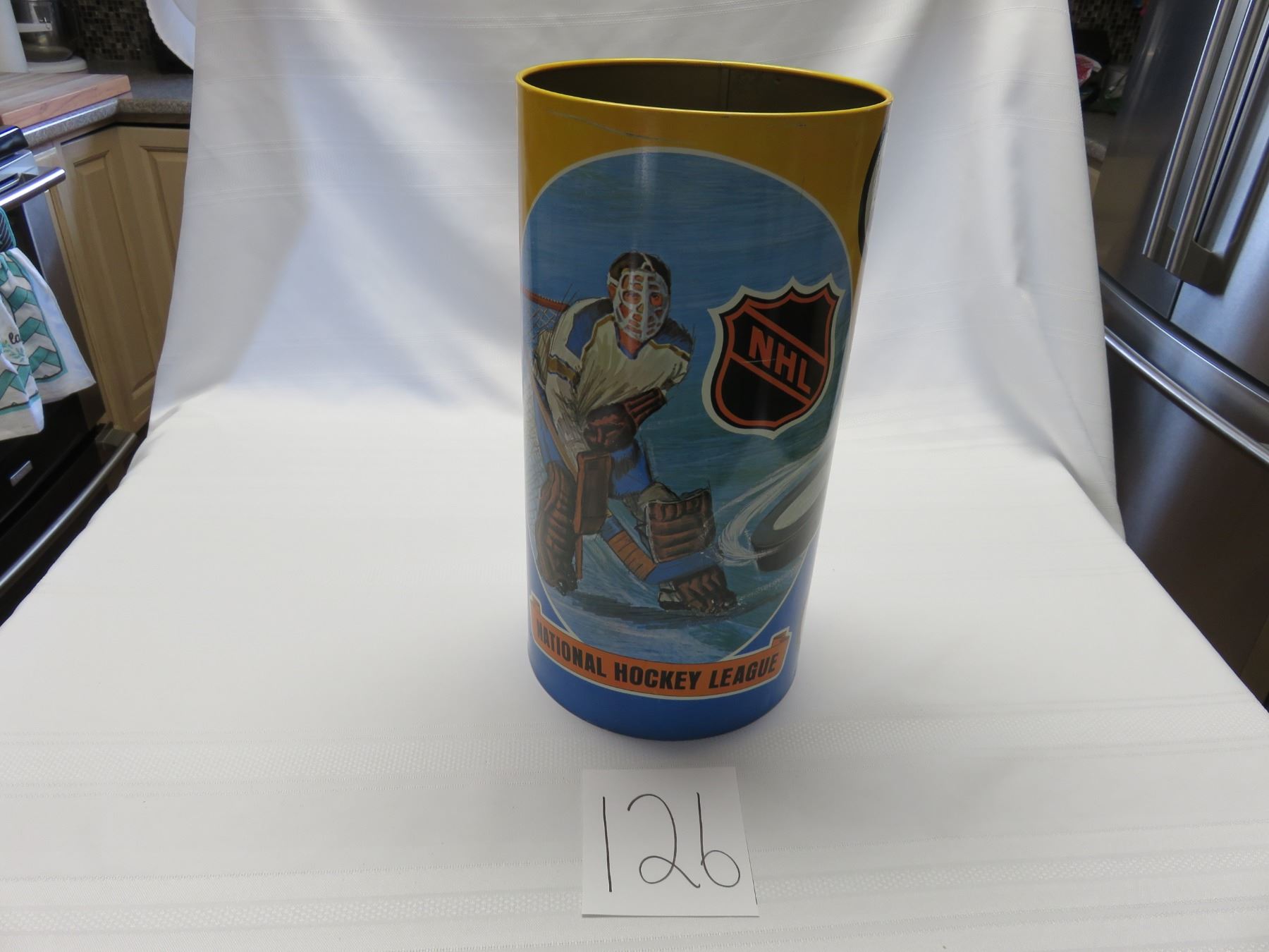 1971 mint 16 X 8.5" NHL wastebasket, old, California seals and Minnesota North Stars 14 teams, unique
