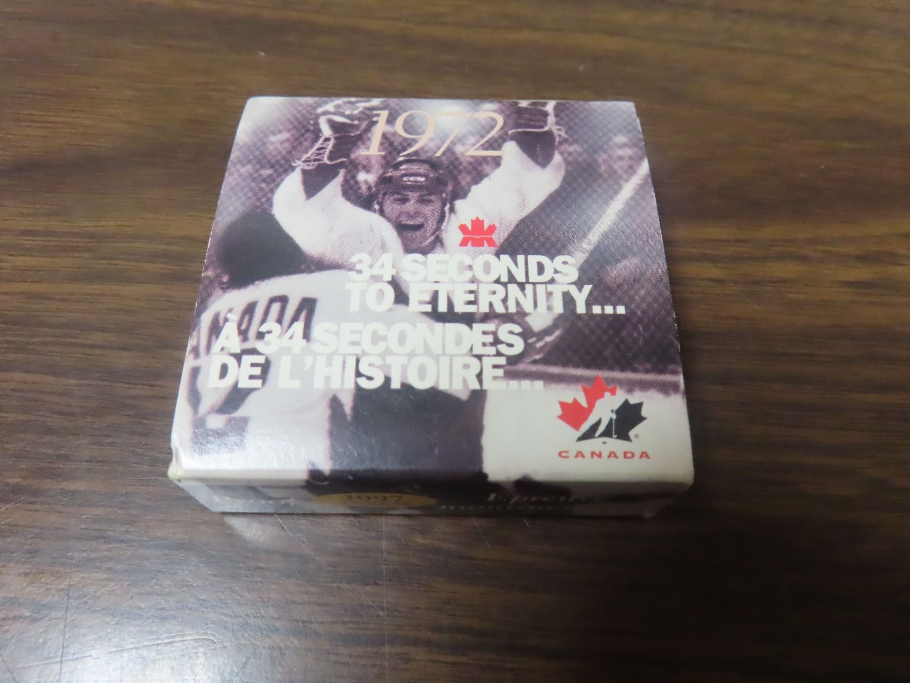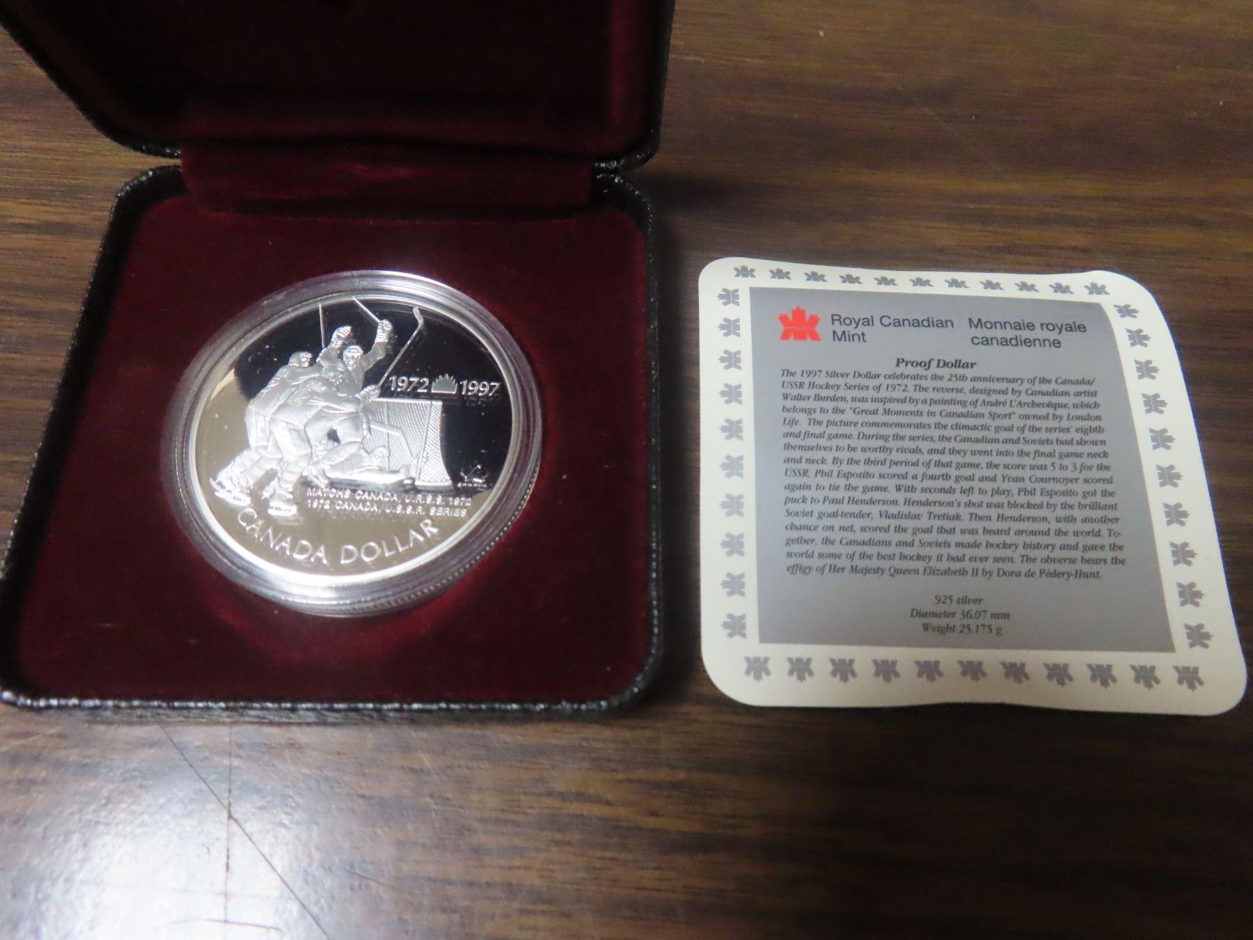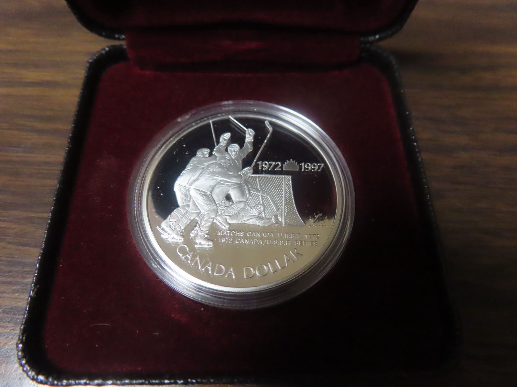 1972 – 1997 25th Anniversary of the 1972 Canada-Russia Hockey series Silver Dollar. Proof with Ultra Heavy Cameo. Housed in its original Royal Canadian Mint case of issue. Includes Certificate of Authenticity.