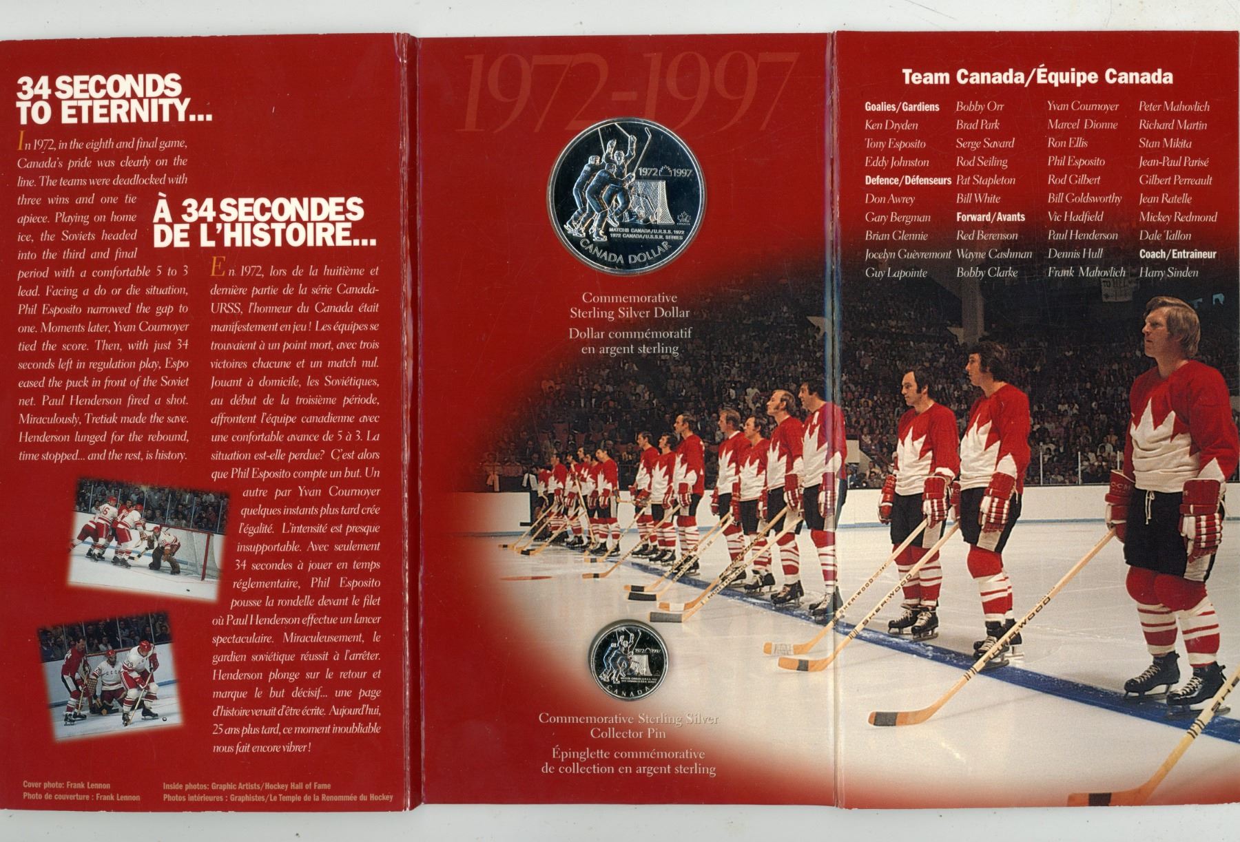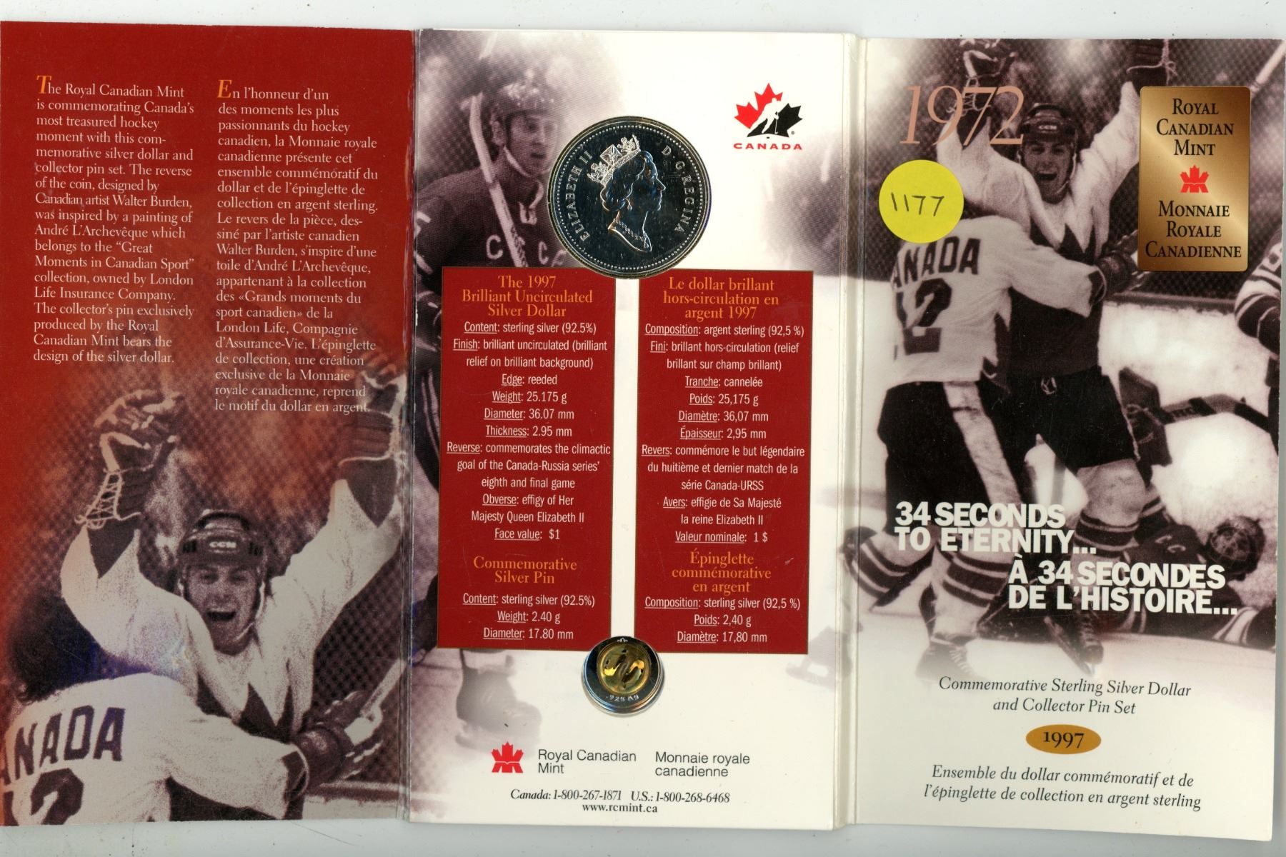 1972 – 1997 Canada Russia Hockey Series Silver Dollar. Specimen. Includes Sterling Silver Pin. Housed in its original RCM folder.