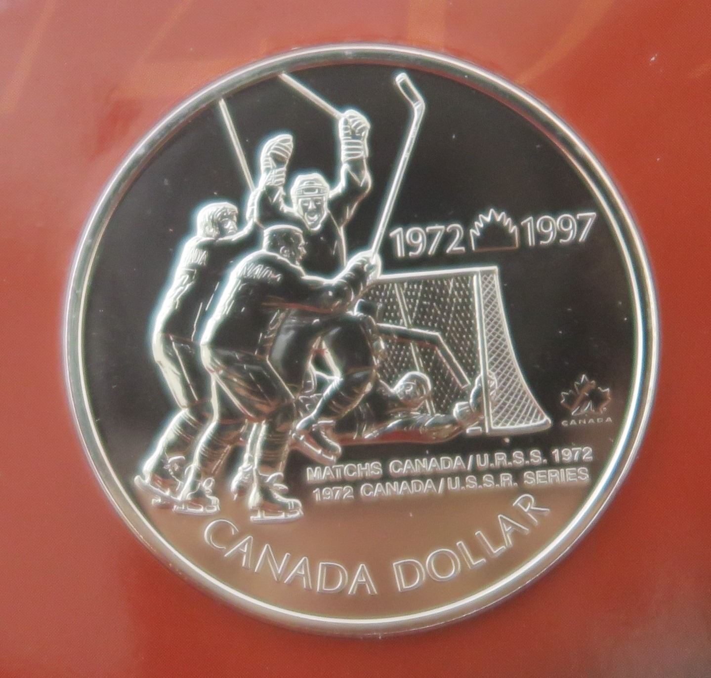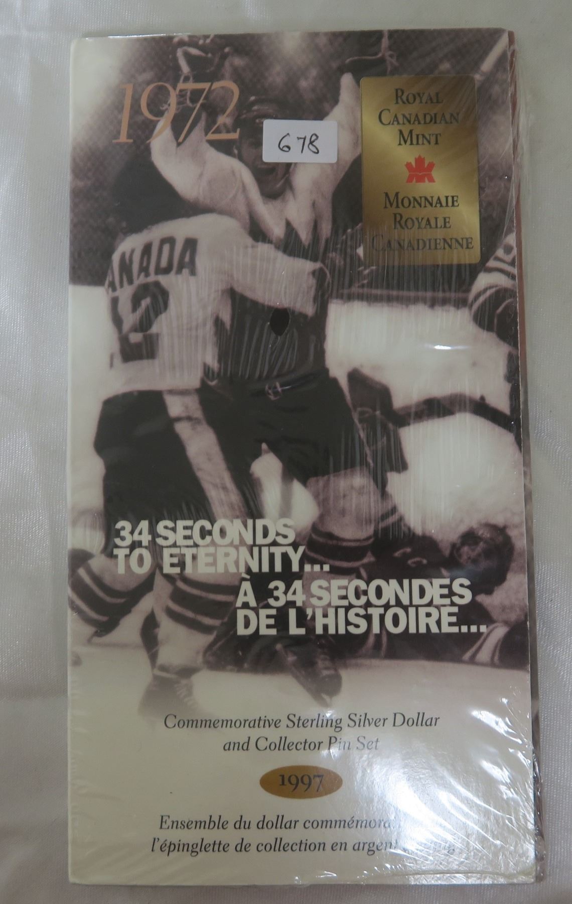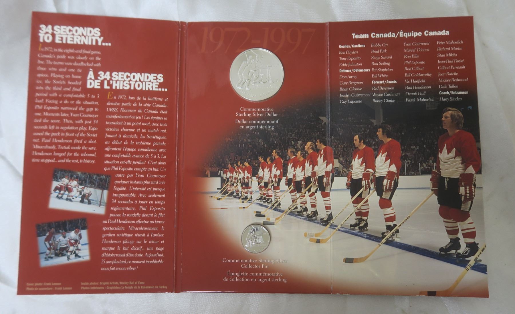 1972 – 1997 Canada Russia Hockey Series Sterling Silver Dollar & Collector Pin Set. Housed in its unopened RCM folder.