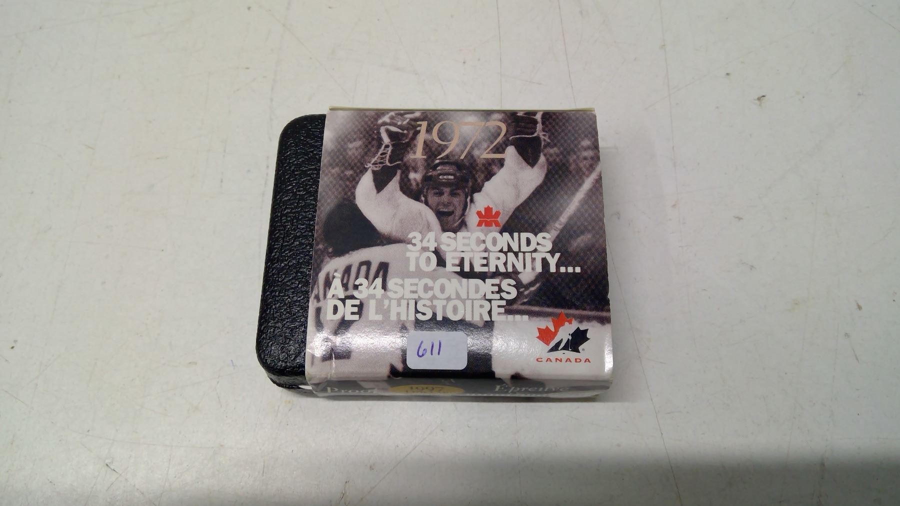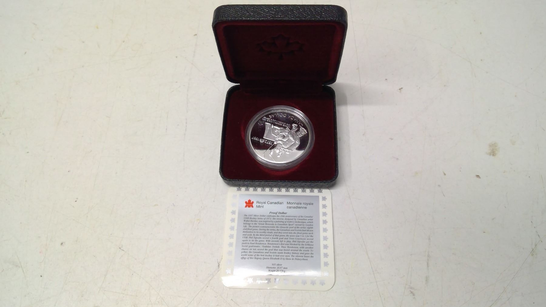 1972 – 1997 Canadian Silver Dollar. Commemorates the 25th Anniversary of Team Canada defeating the Russians in Canada-Russia Hockey Series in 1972. Sterling Silver. Proof with Ultra Heavy Cameo. Housed in its original Royal Canadian Mint case of issue. Includes Certificate of Authenticity.