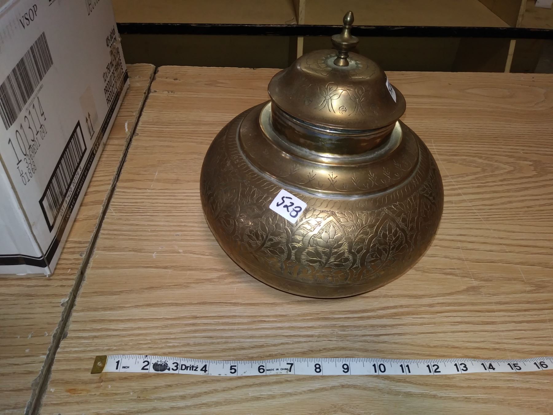 1972 India very fine floral design engraved lidded brass large 11" H container
