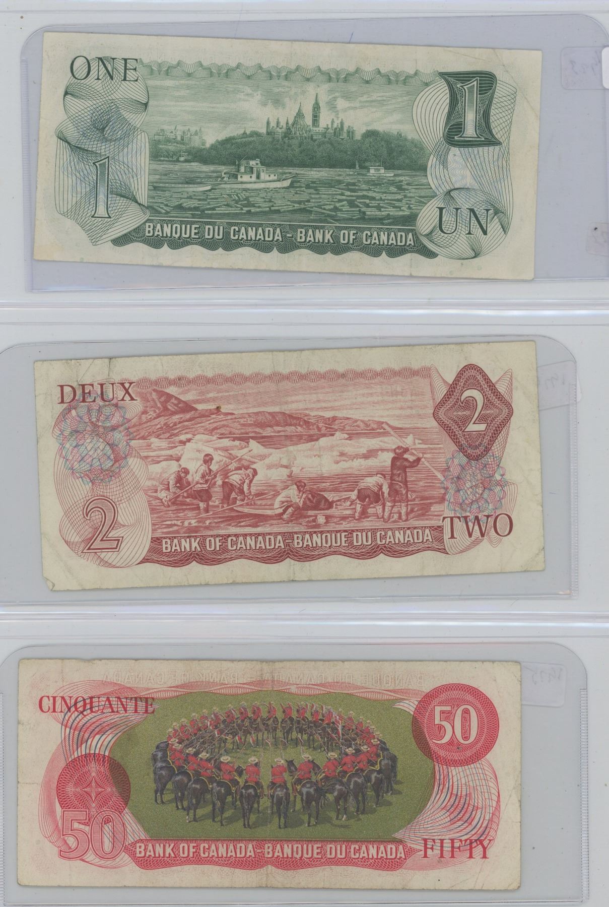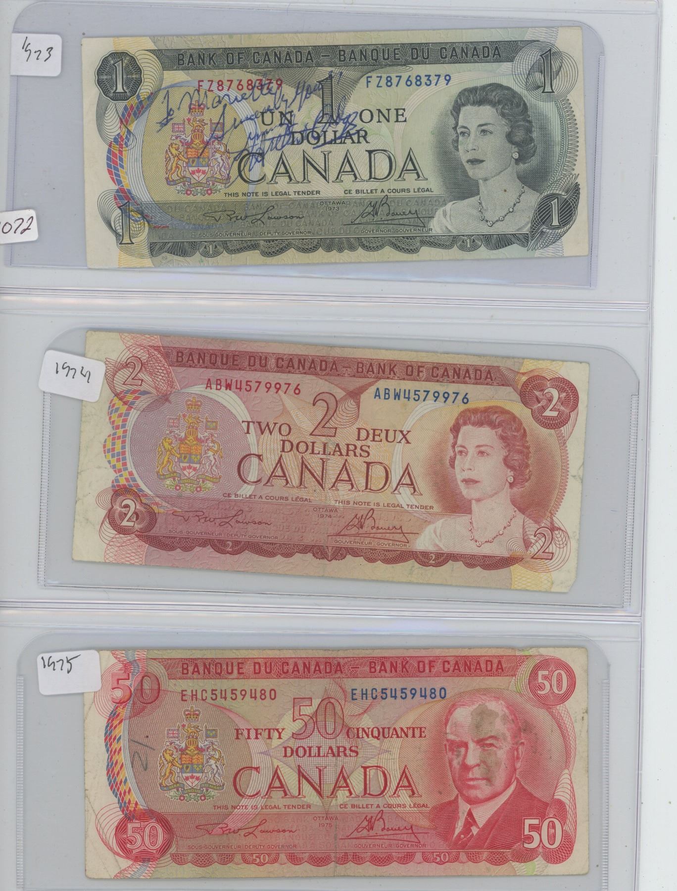 1973 1 Dollar & 1974 2 Dollar & 1975 50 Dollar Canadian Bills