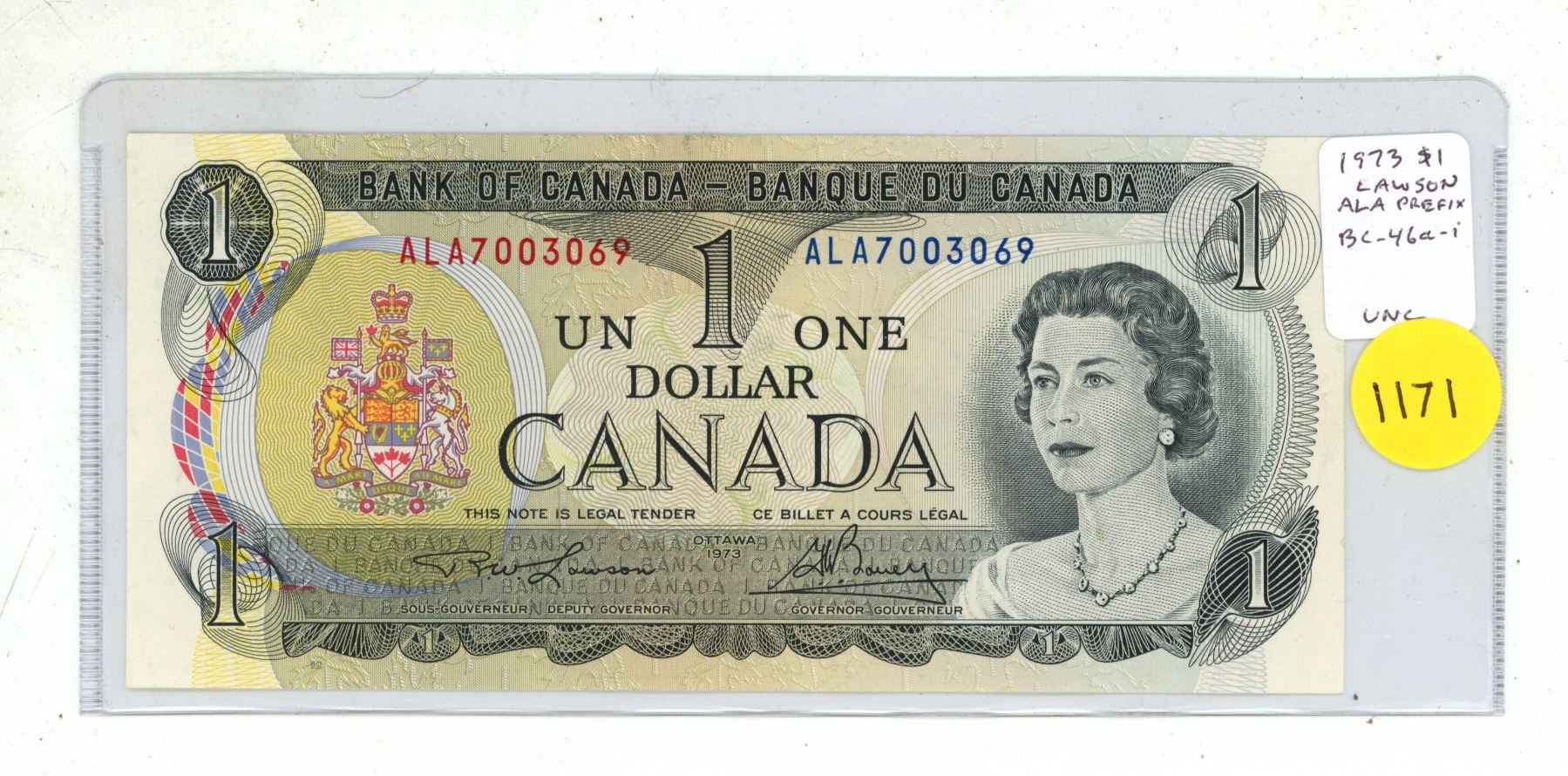 1973 $1. Lawson-Bouey signatures. ALA Prefix. BC-46a-i. Uncirculated.