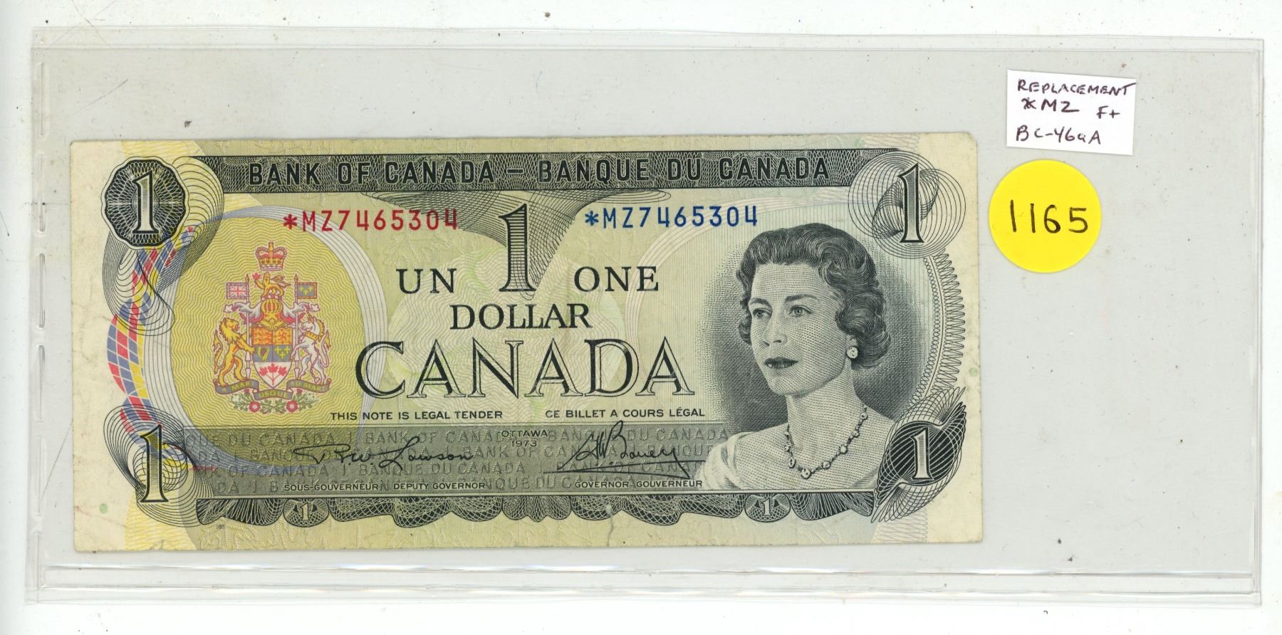 1973 $1 Replacement. Lawson-Bouey signatures. *MZ Replacement Prefix. BC-46aA. Fine12.