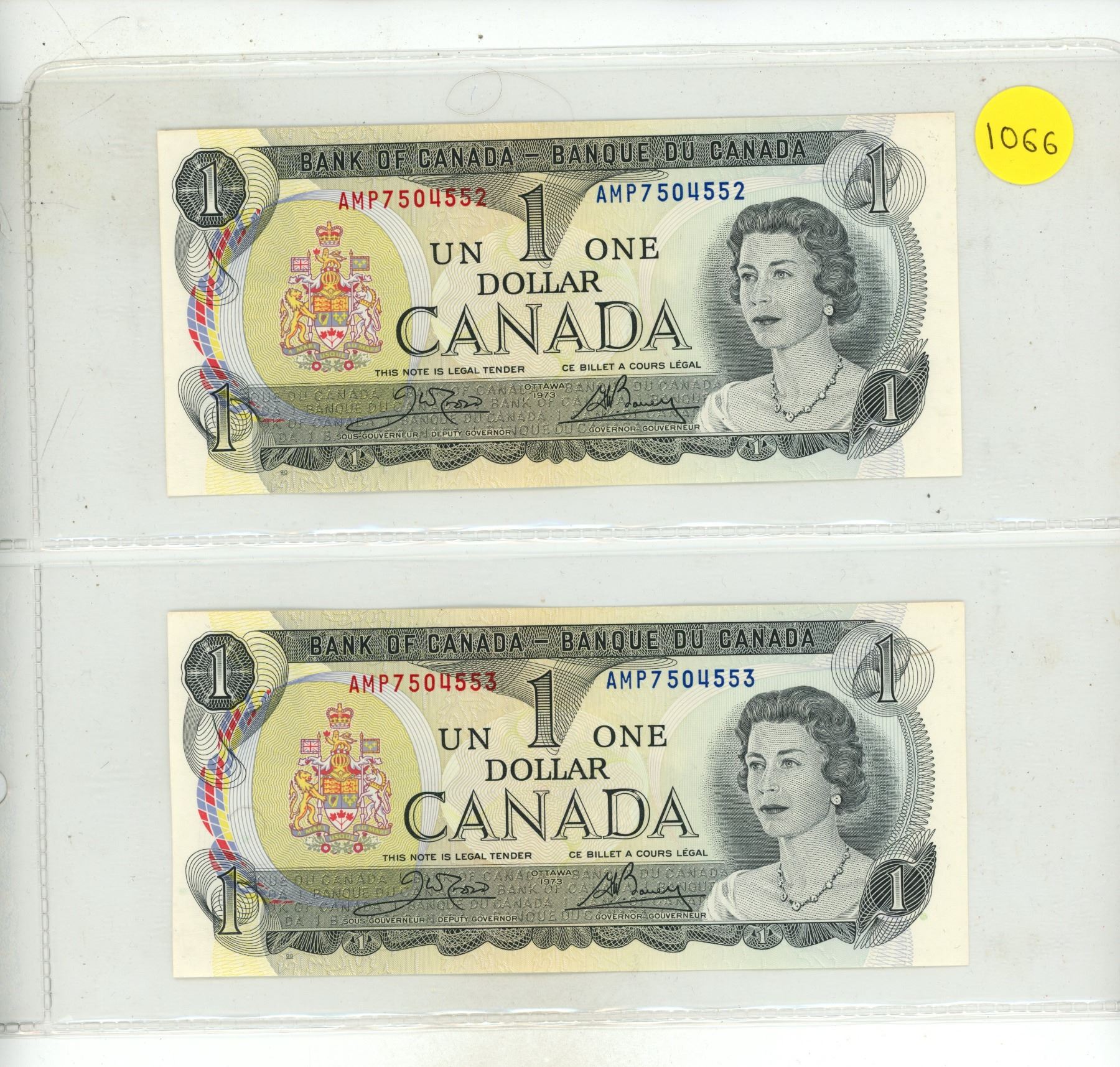 1973 2 Canadian One Dollar Bank Notes In Series