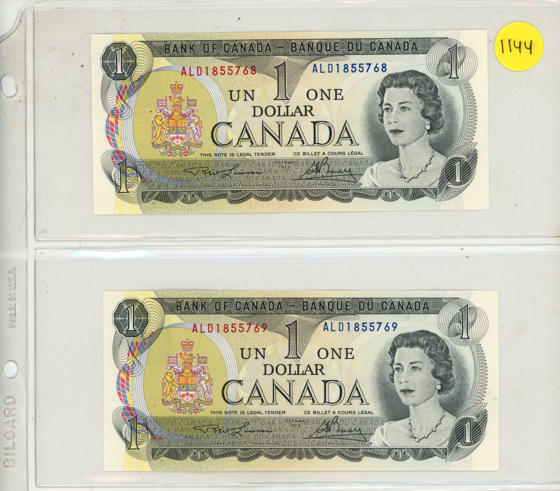 1973 2 Canadian One Dollar Bank Notes In Series