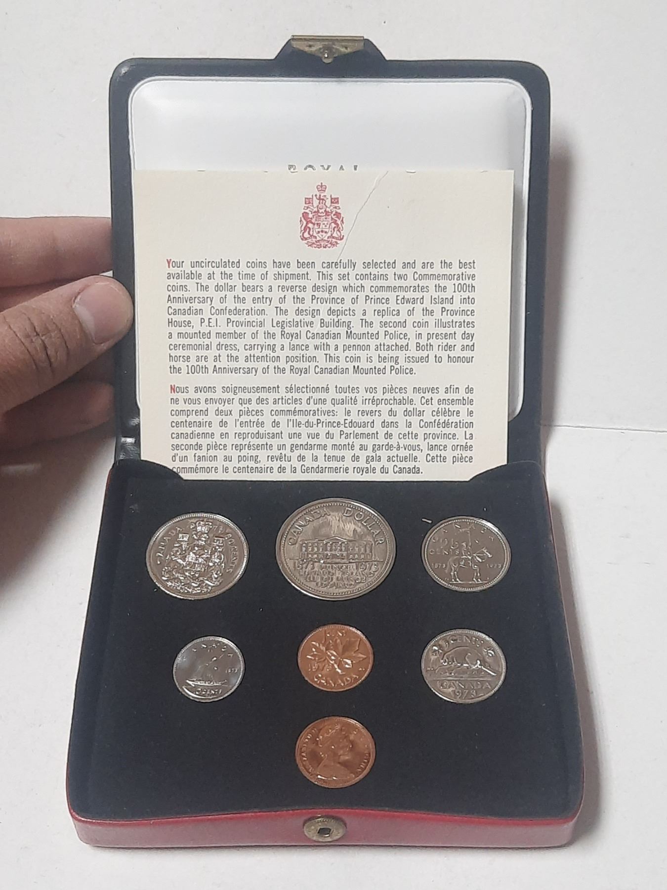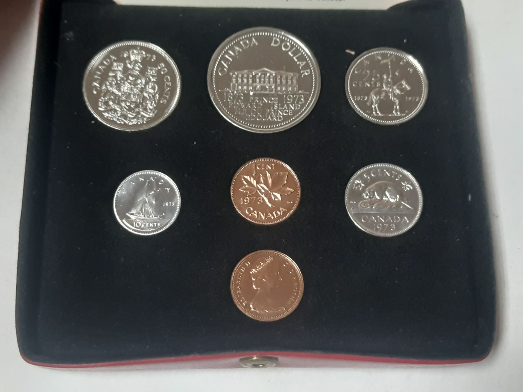 1973 7-coin Custom Set with two 1 Cent coins. Housed in its original RCM case with gold Canada Coat of Arms.