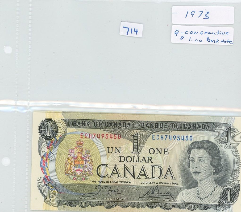 1973 Bank of canada $1.00 Bill Sig. Crow & Bouey 9-Sequencial