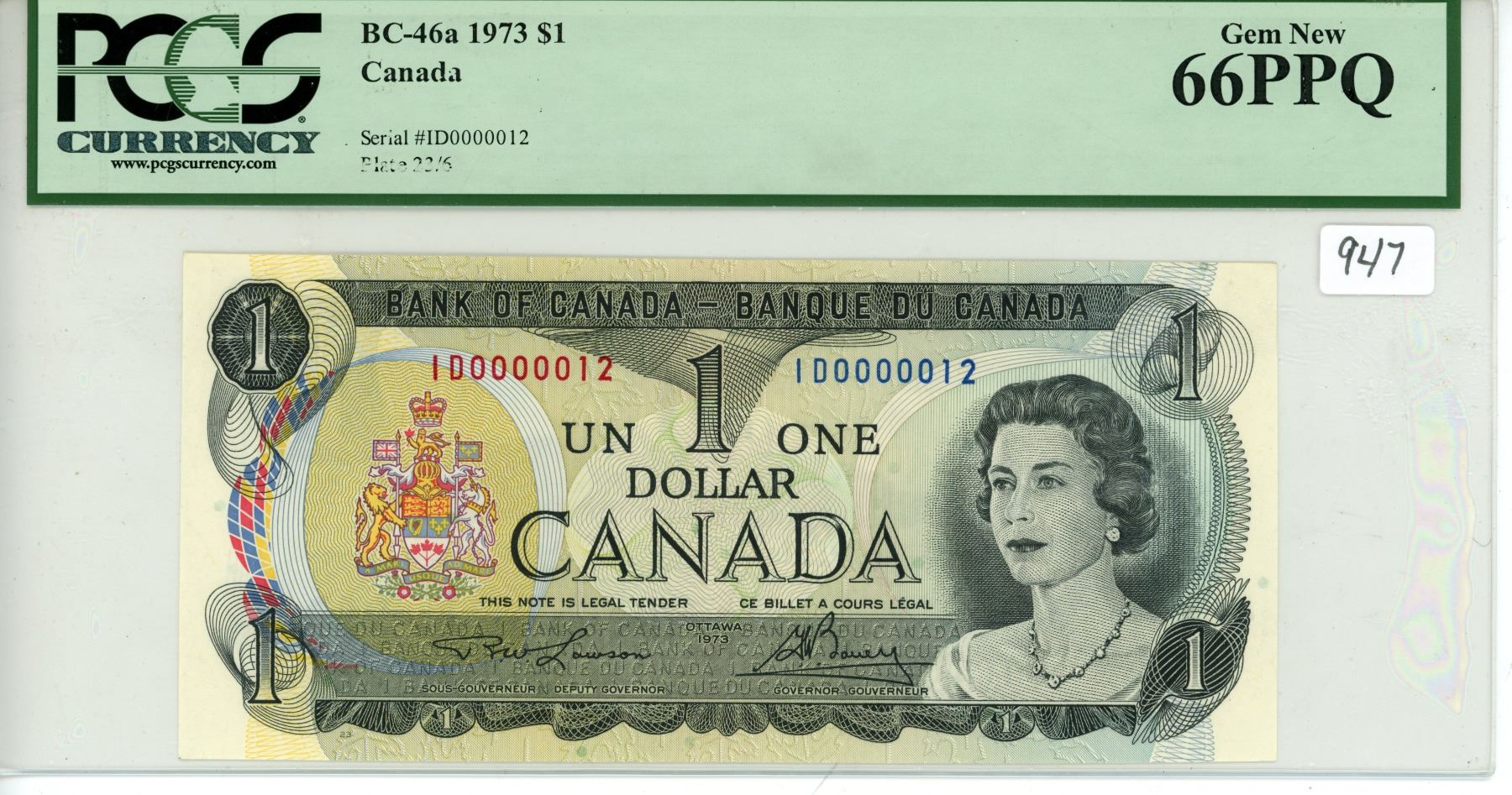 1973 Canadian $1 Bill - PCGS Graded, Low Serial #, Gem New 66PPQ