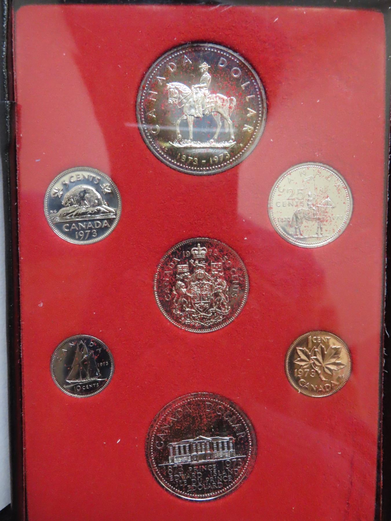 1973 Double Dollar Specimen Set. The Silver Dollar commemorates the 100th Anniversary of the RCMP. The Silver Dollar is beautifully toned. The Nickel Dollar commemorates the 100th Anniversary of PEI joining Canada. Housed in its original RCM case. Includes Certificate of Authenticity.