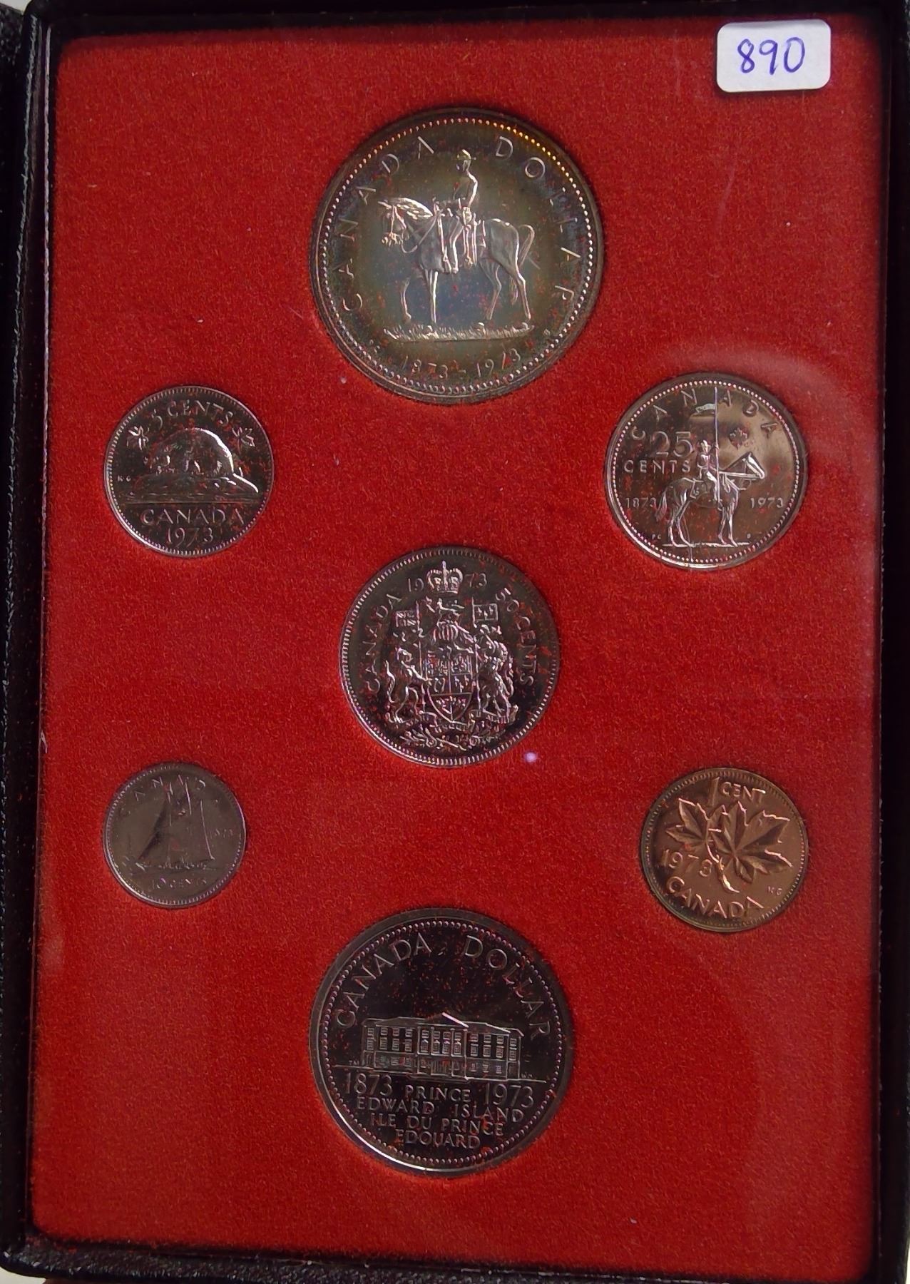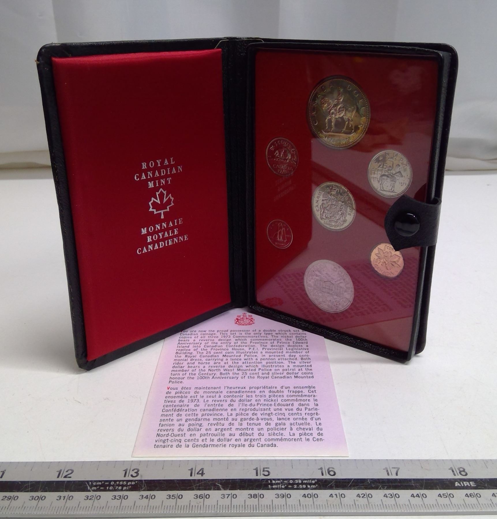 1973 Double Dollar Specimen Set. Two Dollars (one Silver, one nickel) commemorate the 100th Anniversary of the RCMP & PEI. Housed in its original Royal Canadian Mint case of issue.