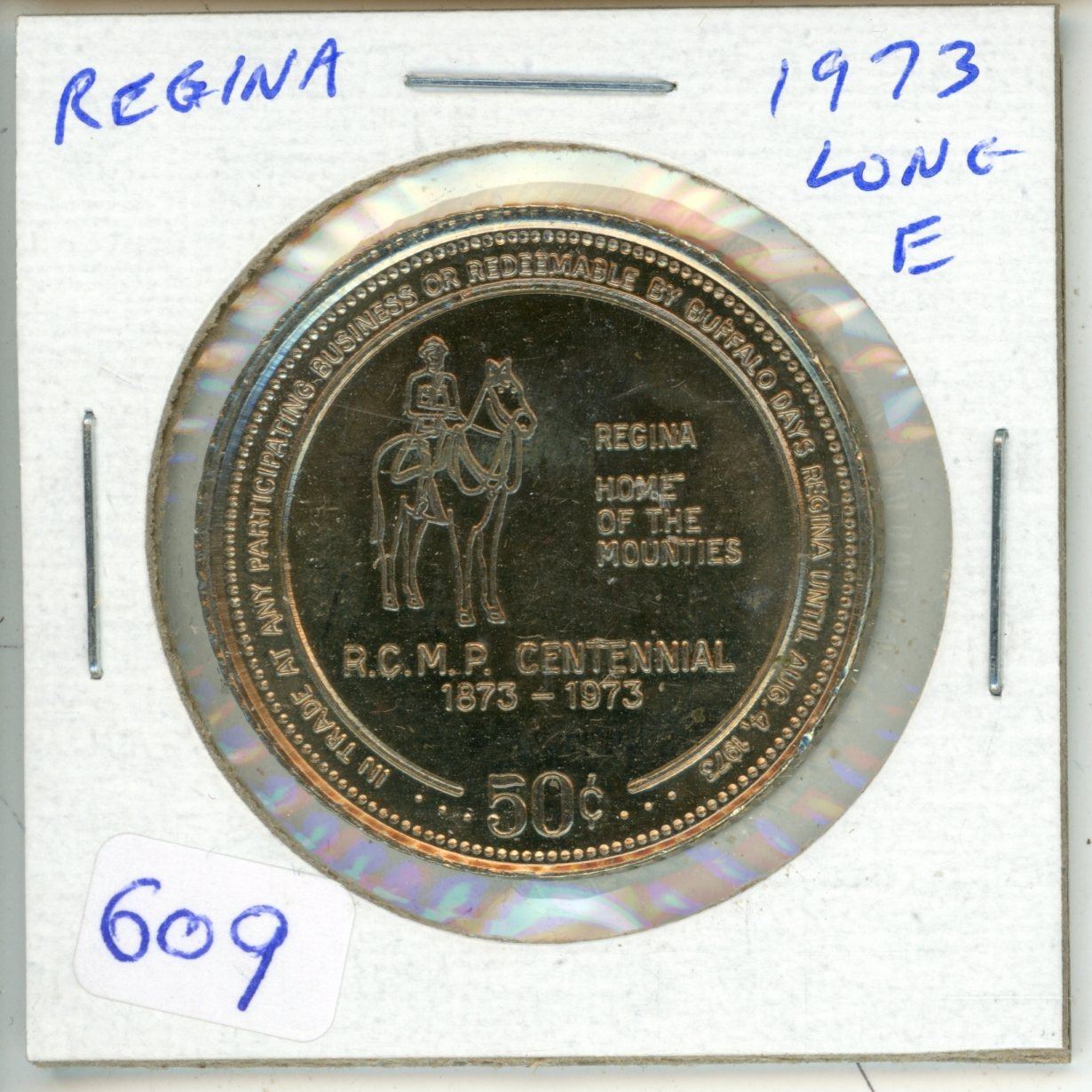 1973 Regina Trade Dollar. Commemorates the 100th Anniversary of the RCMP. This variety of the 1973 Regina Trade Dollar has a long E in HOME. BU.