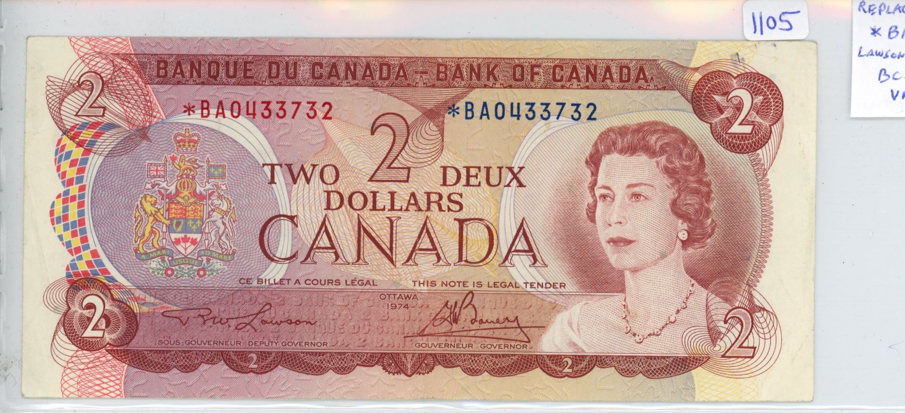 1974 $2 Replacement. Lawson-Bouey signatures. *BA Replacement Prefix. BC-47aA. VF-30.